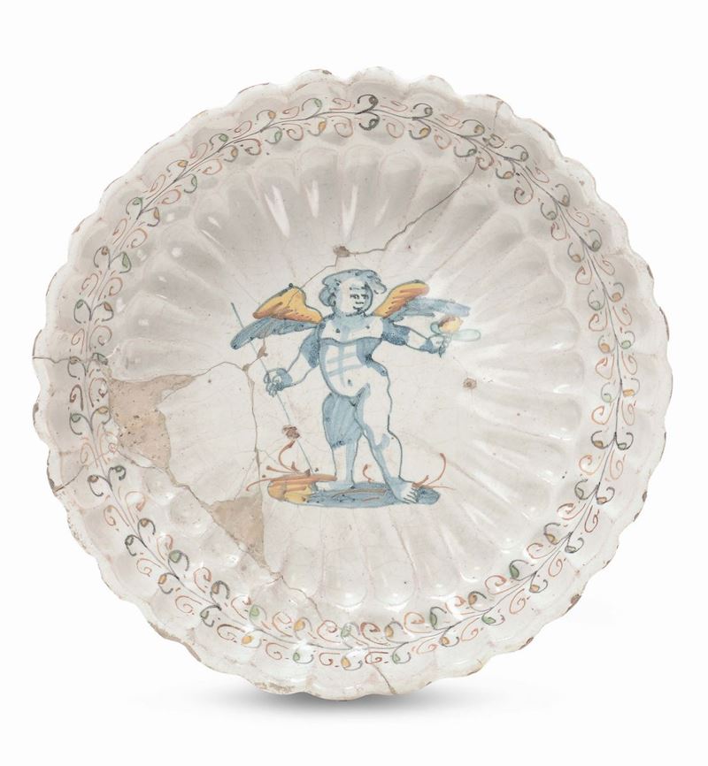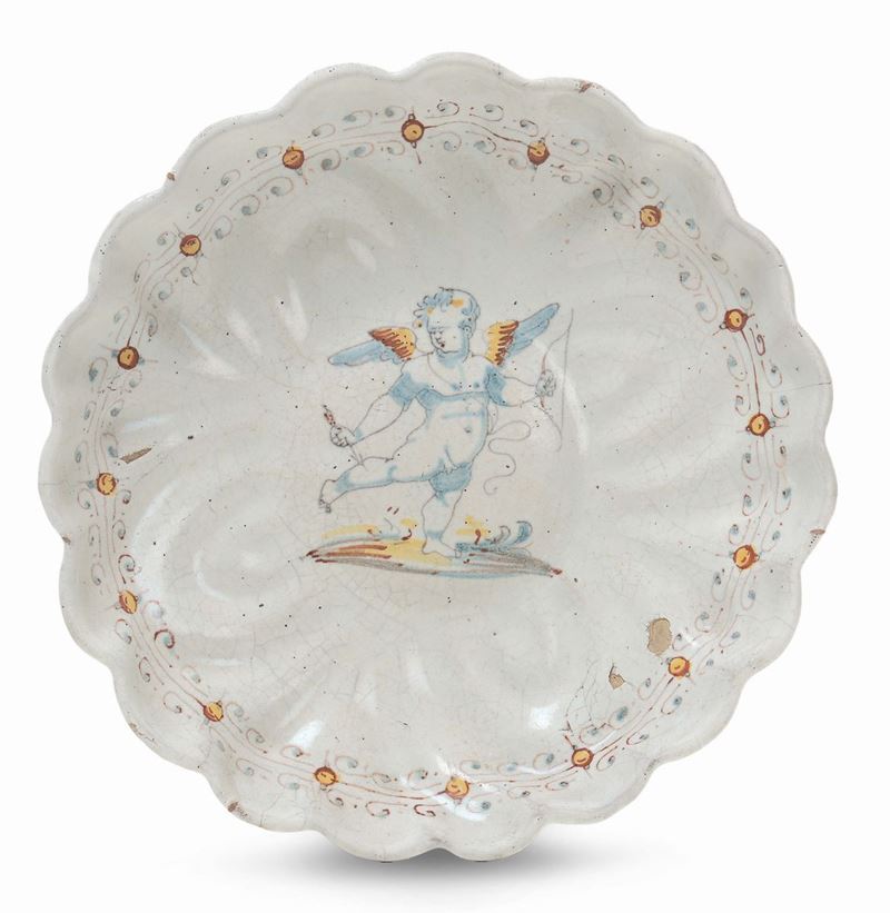 bordo sagomato, decoro policromo di putti al centro del cavetto, diametri cm 24 e cm 23,5