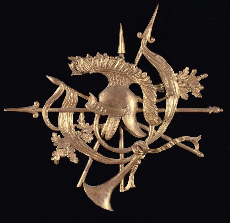 Due elementi in legno intagliato con trofei, XIX secolo
