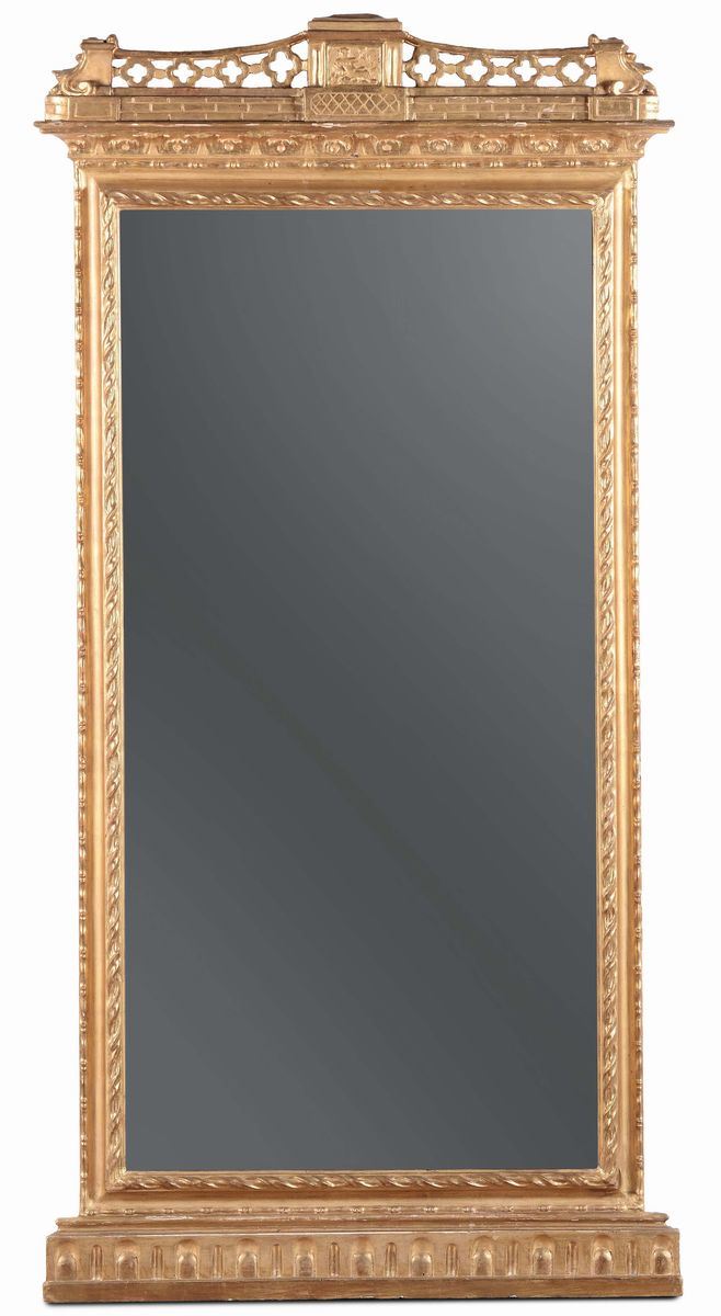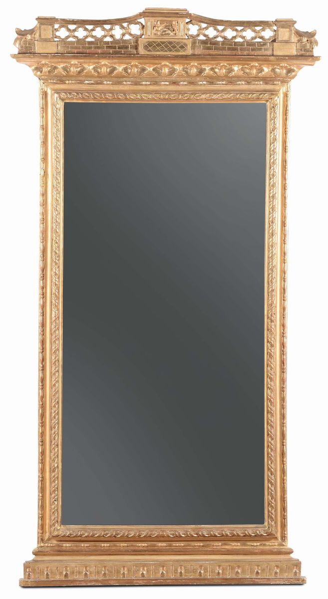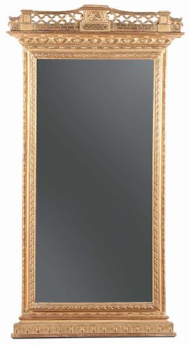 Due specchiere simili in legno intagliato e dorato, XIX secolo