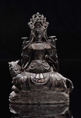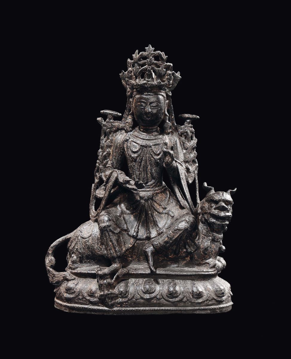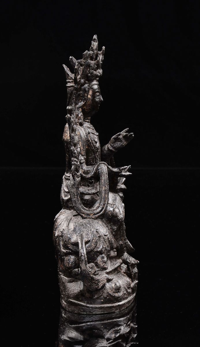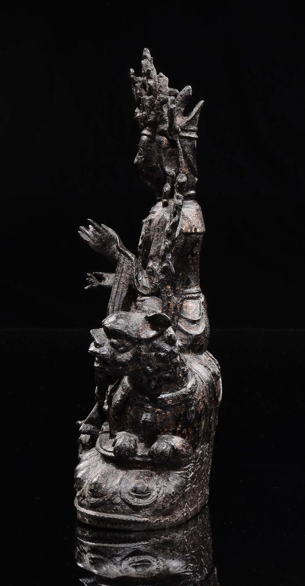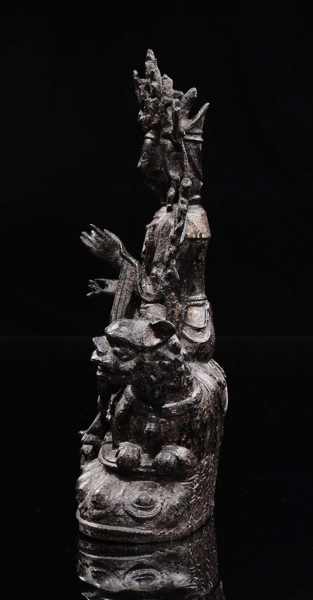 Figura in bronzo raffigurante guanyin con leone assiso, Cina dinastia Ming, fine XVI inizi XVII secolo