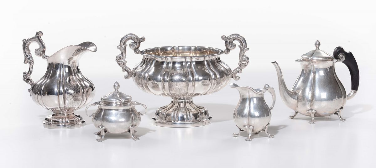 composto da coppa biansata, brocca, teiera, lattiera e zuccheriera, gr. 1000 circa