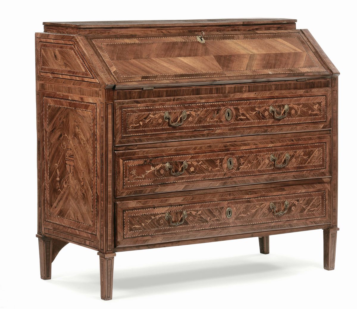 fronte e fianchi dritti, decori a motivo vegetale e floreale, tre cassetti sotto la calatoia che cela sei cassettini, cm 124x59x115