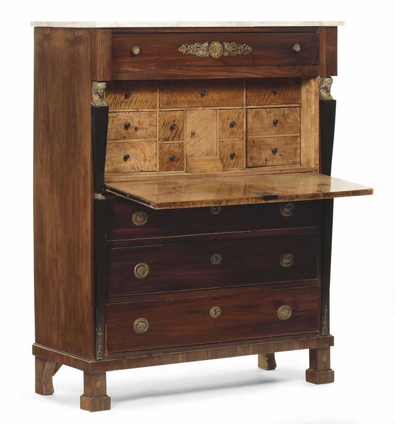 tre cassetti sotto la calatoia ed uno sulla sommità, lesene ebanizzate sui montanti terminanti con teste di sfinge, cm 110x51x149