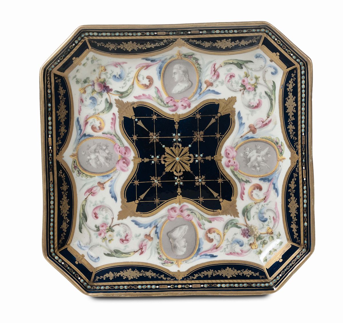 decori policromi floreali, profili e colombe entro riserve ovali, bordura a fondo blu con decori in oro, cm 26,5x26,5