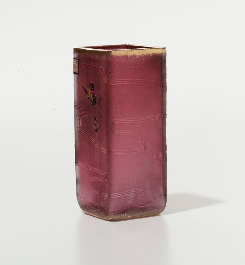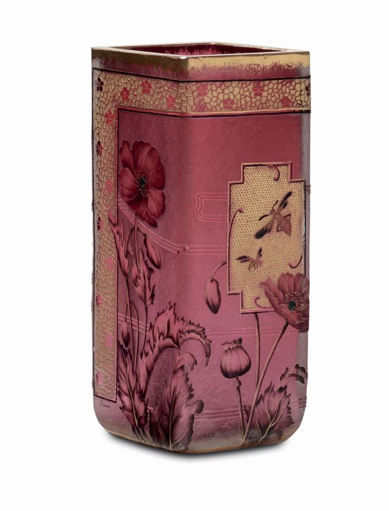 Vaso a sezione quadrata in vetro rosso con raffinata lavorazione a cammeo all'acido e alla ruota; decoro di papaveri e insetti rifinito con smalti policromi e oro. Firma a smalto sotto la base. Altezza cm 17. 1895 circa