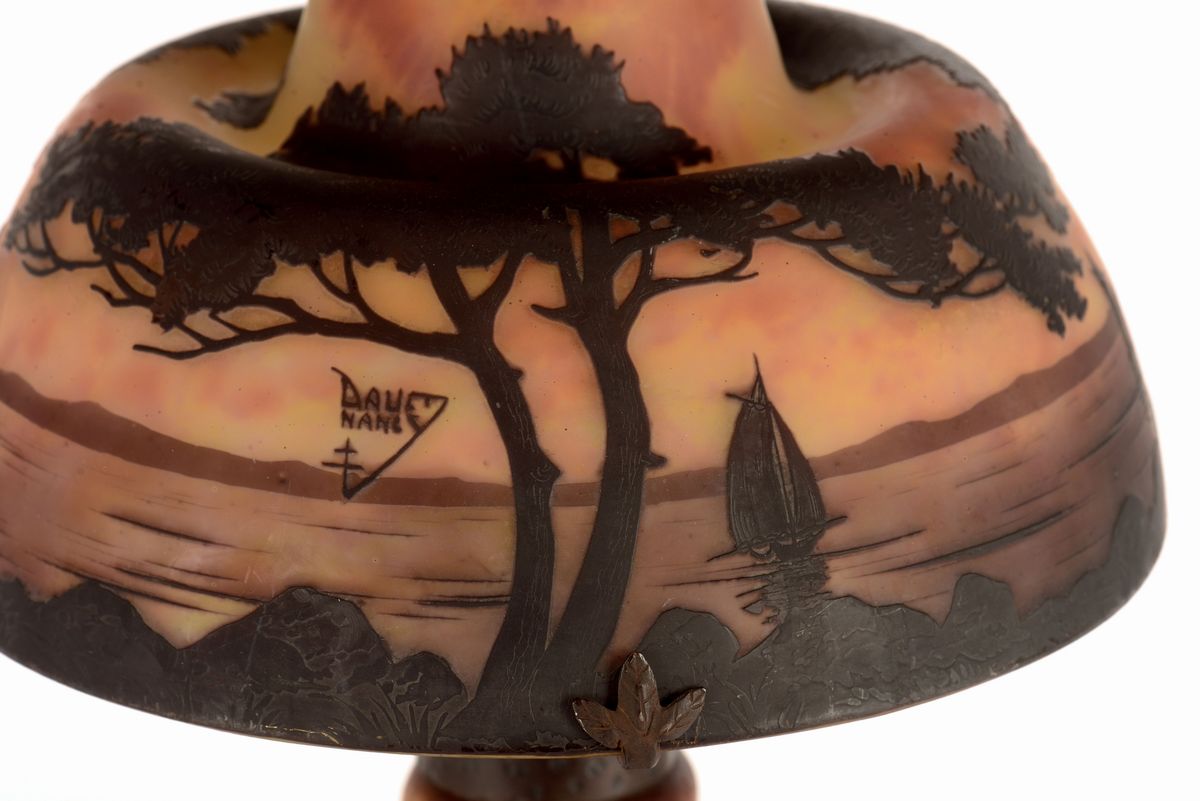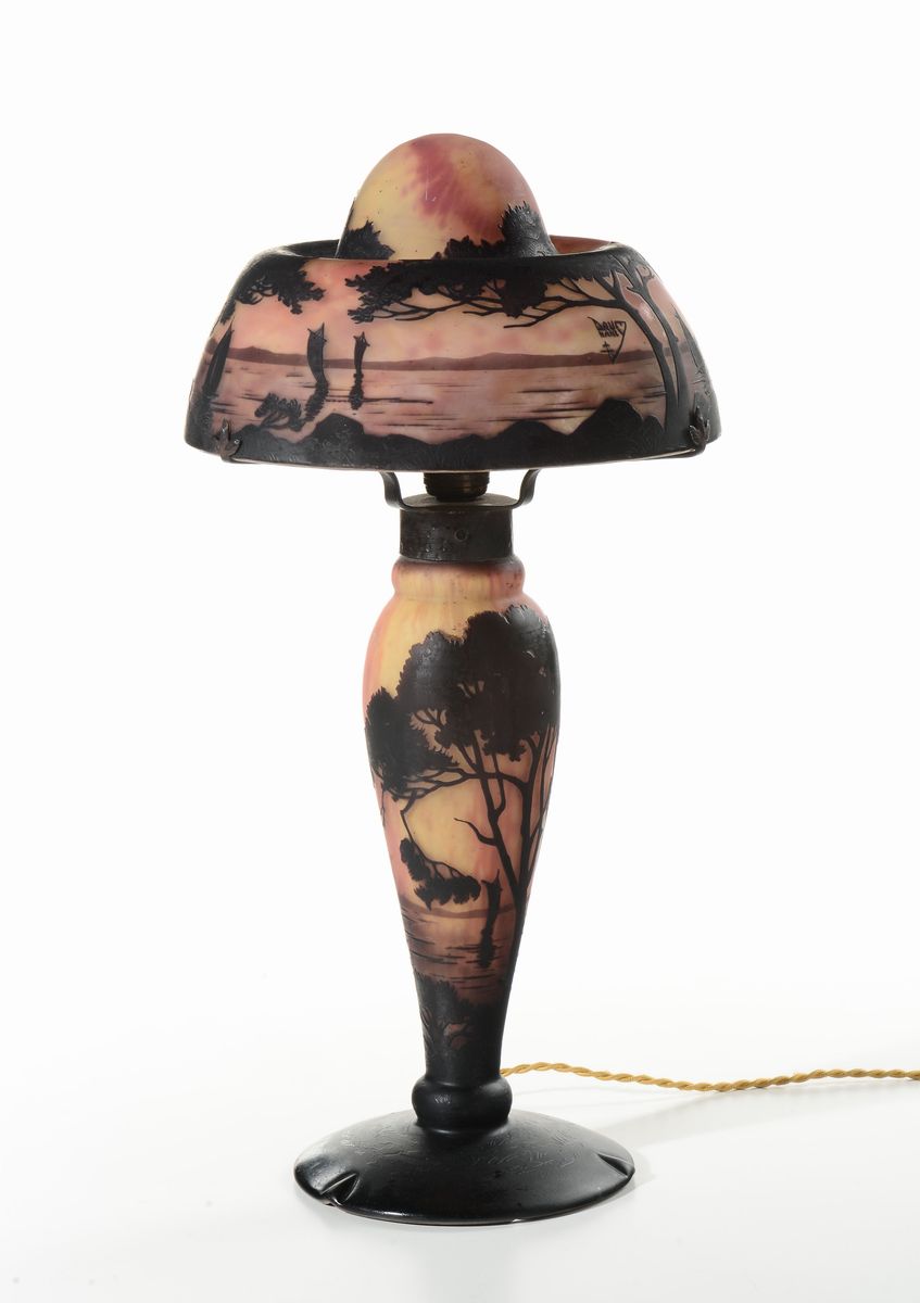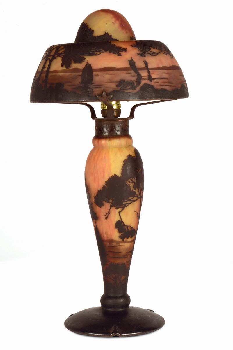 Lampada a fungo in vetro multistrato nei toni dell'arancio e del marrone; lavorazione a cammeo con decoro di paesaggio lacustre. Firma in rilievo sul cappello. Altezza cm 56. 1910 circa