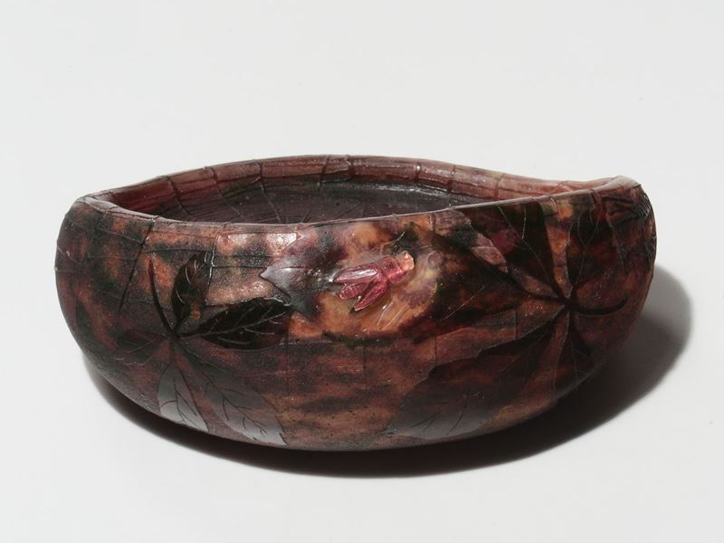 Vuotatasche in vetro multistrato con inclusione di polveri vitree policrome. L'esterno dell'oggetto è lavorato a cammeo con foglie di castagno e ha una mosca applicata; l'interno presenta una impercettibile ragnatela su cui poggiano due lumachine. Firma a cammeo nel decoro. Dimensioni: cm 7x14x11. 1900 circa