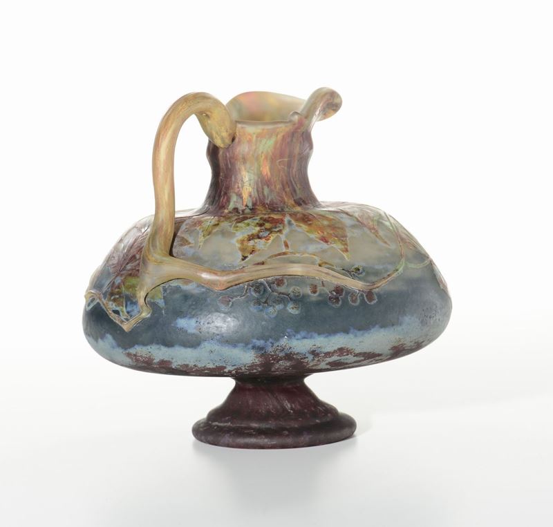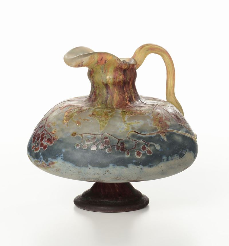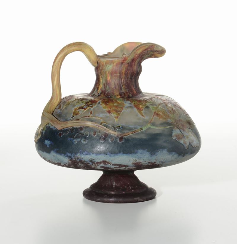 Brocca in vetro intercalare policromo doppiato e lavorato a cammeo alla ruota con decoro di vite americana. Il manico applicato è parte integrante del decoro. Firma incisa Daum Nancy e Croce di Lorena. 1910-1920. Altezza cm 21