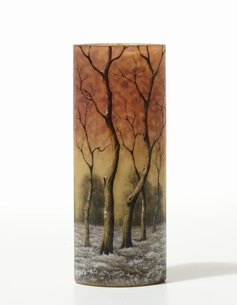 Vaso a sezione ovale in vetro multistrato policromo con decoro di bosco innevato inciso ad acido e ripreso a smalto al terzo fuoco. Firma a smalto sotto la base. Altezza cm 30. 1910 circa