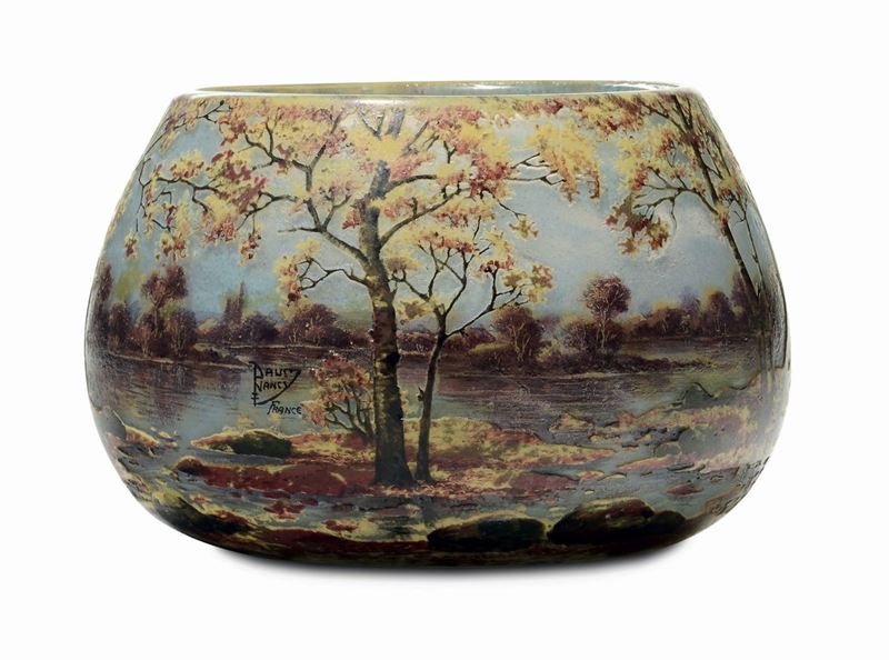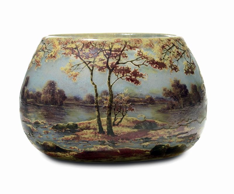Vaso a sezione circolare in vetro multistrato policromo con bellissimo decoro di paesaggio lacustre autunnale. La lavorazione è a cammeo e smalti policromi. Firma a smalto nel decoro. Altezza cm 14,5, diametro cm 22. 1910 circa