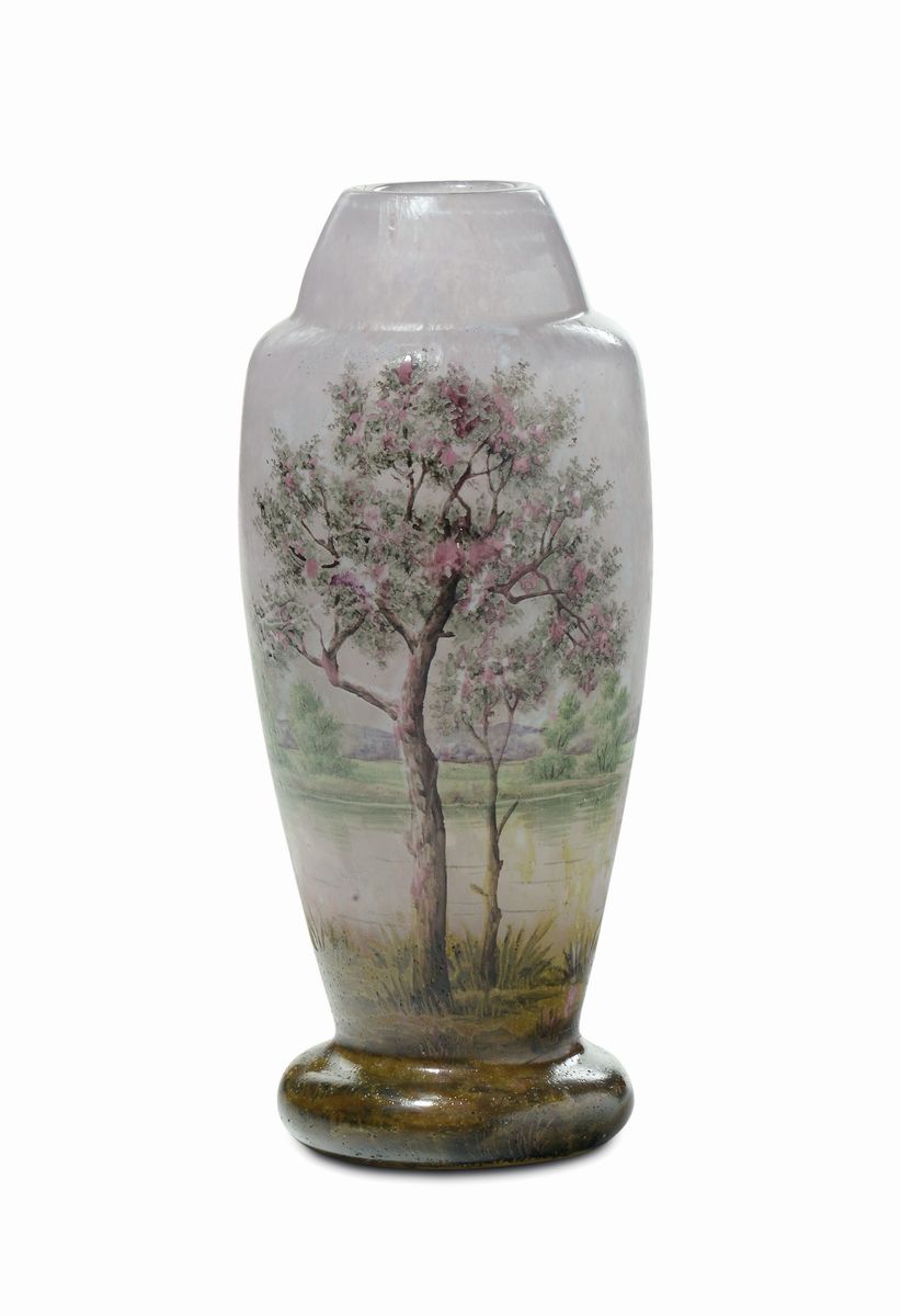 Vaso in vetro multistrato lavorato a cammeo e smalti policromi con decoro di bosco primaverile. Firma a smalto nel decoro, Altezza cm 22. 1910 circa