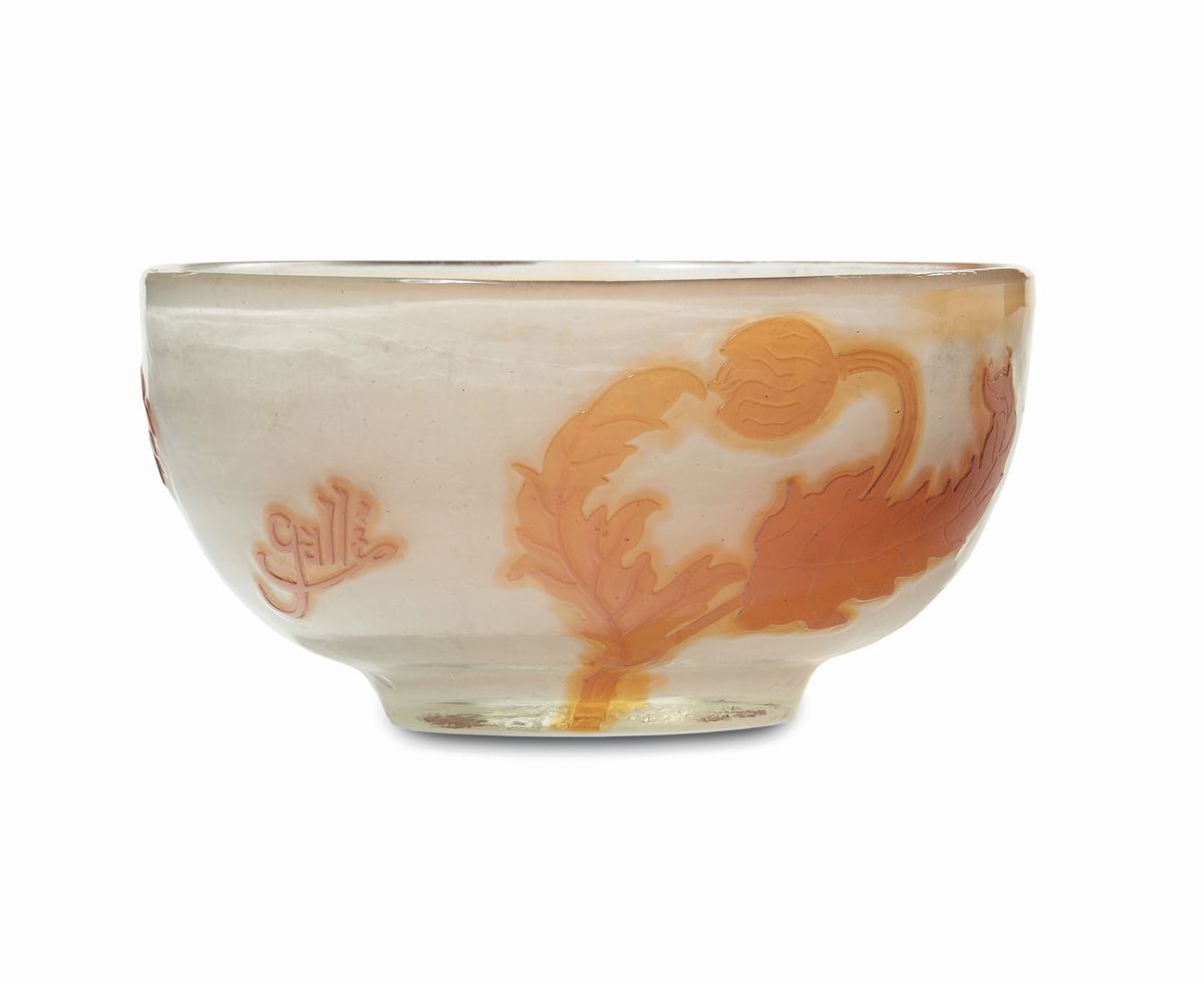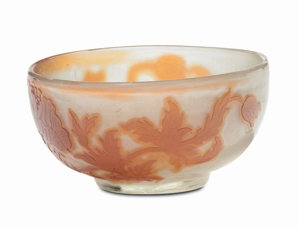 Piccola coppa in vetro lattimo doppiato in vetro ocra, lavorato a cammeo con decoro floreale e lucidato alla ruota. Firma in rilievo. Altezza cm 6, diametro cm 12. 1900 circa