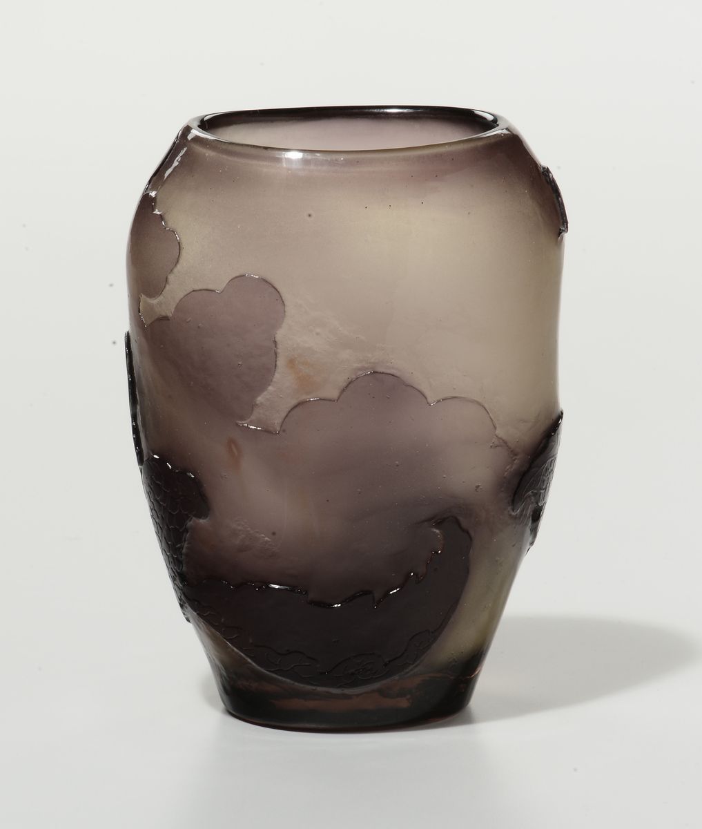 Delizioso piccolo vaso della serie verrerie parlante. Vetro violaceo e lattimo lavorato a cammeo e a marqueterie con decoro floreale. Nel corpo, a cammeo, la frase: Bonheur Bon An Bon Siécle. Firma a cammeo. Altezza cm 12. 1900