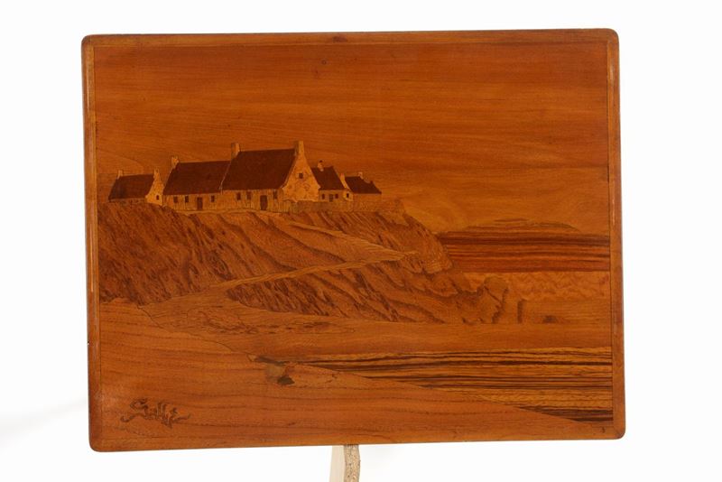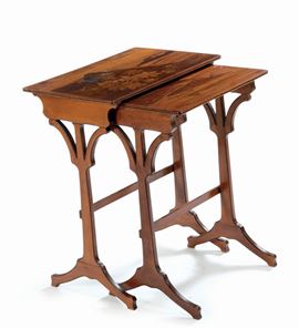 Due piccoli tavoli a nido, lastronati in varie essenze e decorati con vedute di paesaggi, firmati su entrambi i piani, cm 70x58x38. 1900 circa