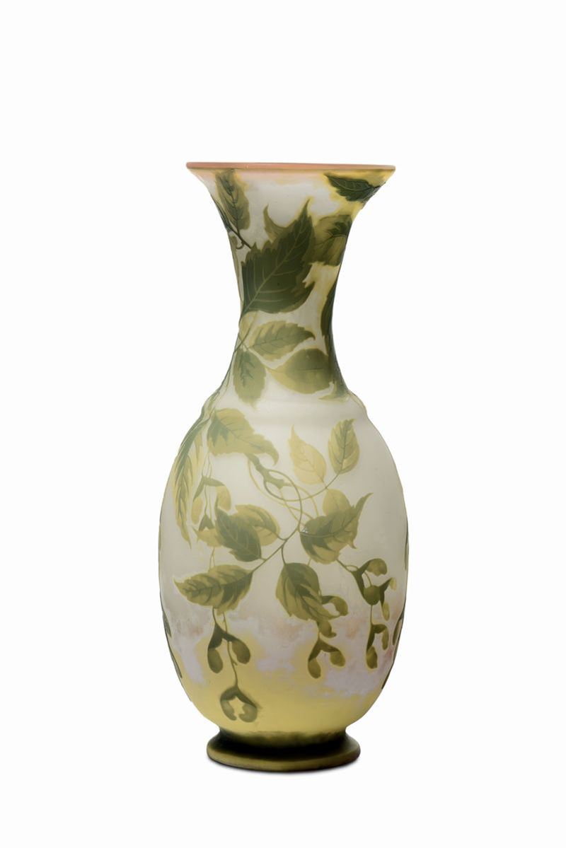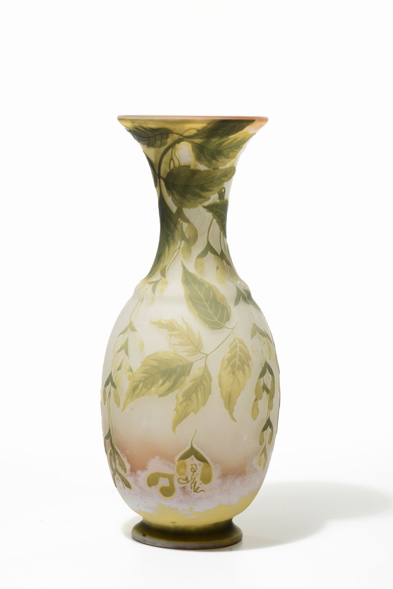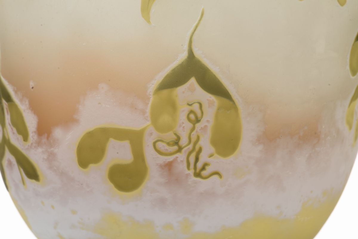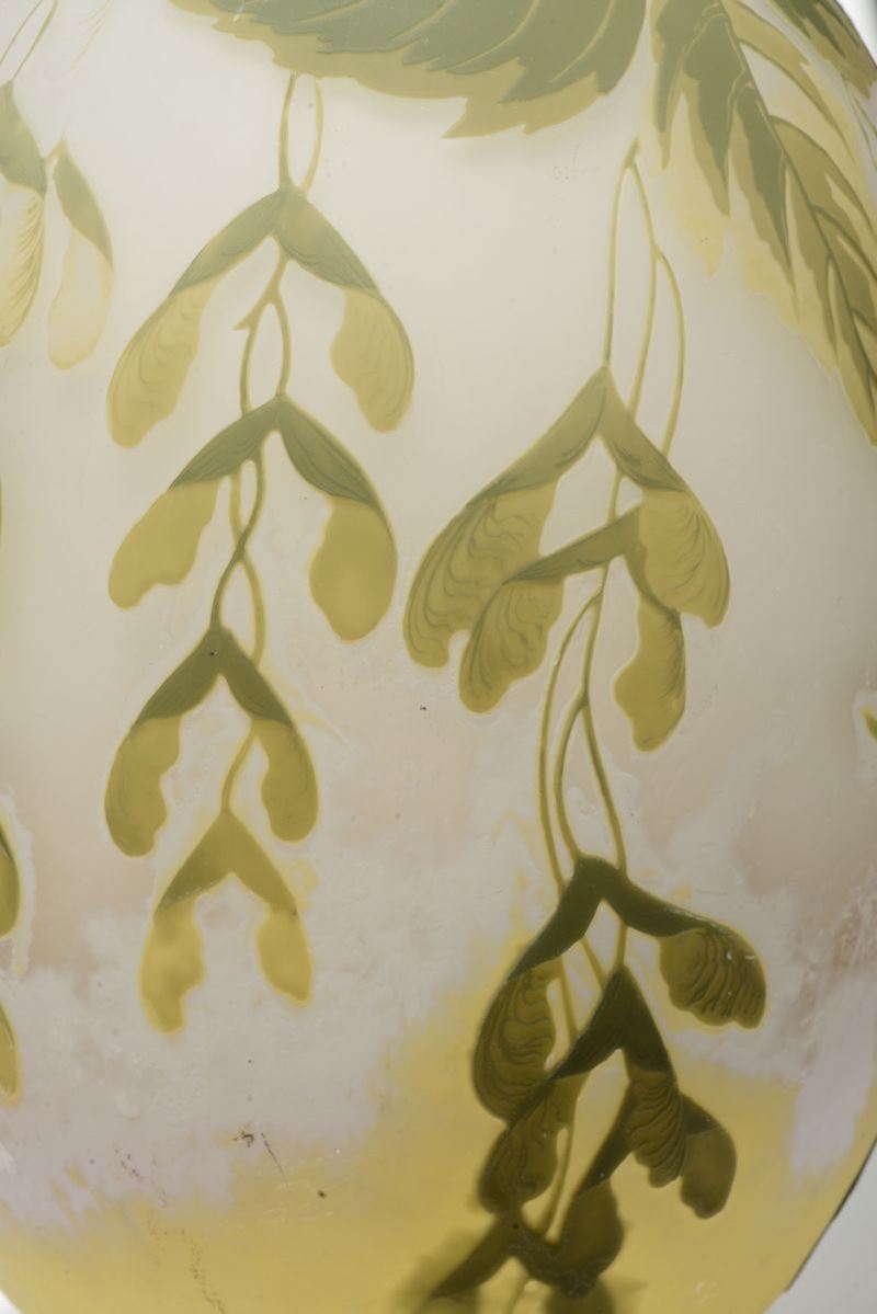 Grande vaso in vetro lattimo con inclusione di ossidi metallici, doppiato in vetro verde ed inciso all'acido a cammeo con decoro vegetale. Firma a cammeo alla giapponese nel decoro. Altezza cm 50. 1900 circa