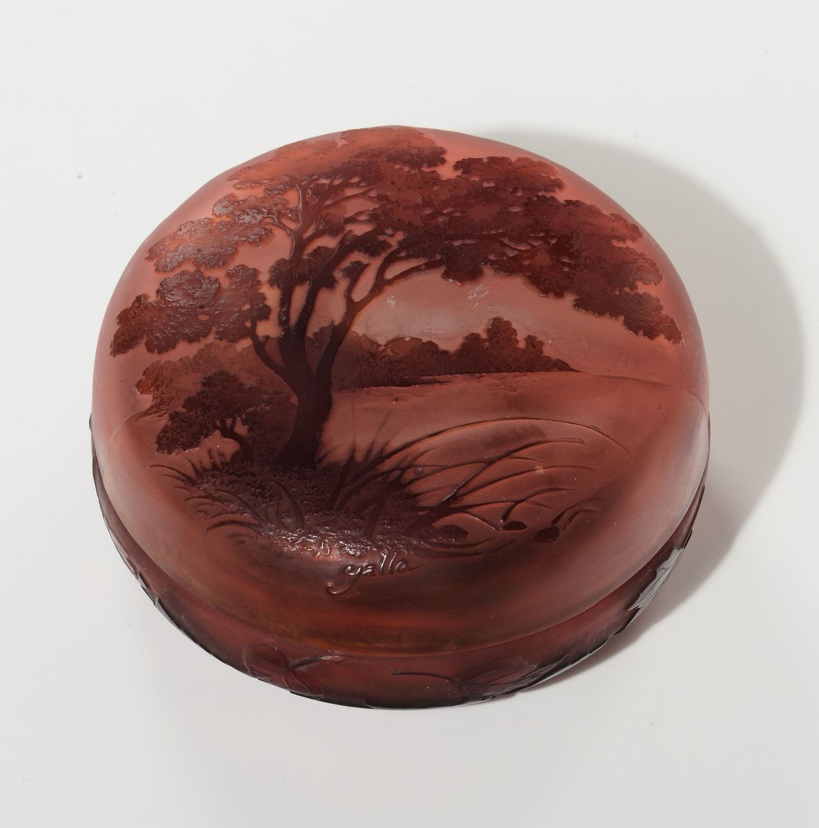 Scatola in vetro rosato doppiato in vetro marrone, lavorato all'acido a cammeo con decoro di paesaggio lacustre. Firma a cammeo su entrambi i pezzi. Diametro cm 15. 1900 circa