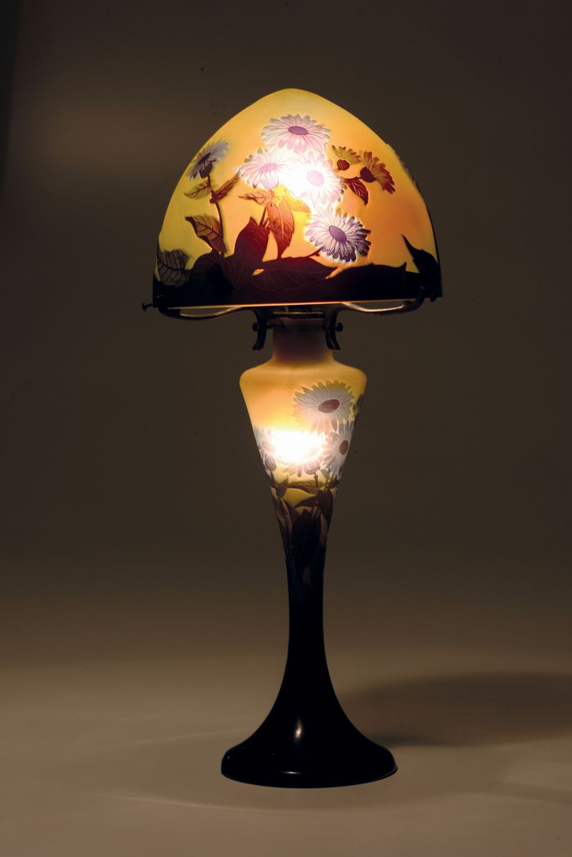 Lampada a fungo in vetro giallo doppiato in azzurro e blu, lavorata a cammeo con decoro floreale. Firma su ambedue i pezzi. Altezza cm 45. 1900 circa