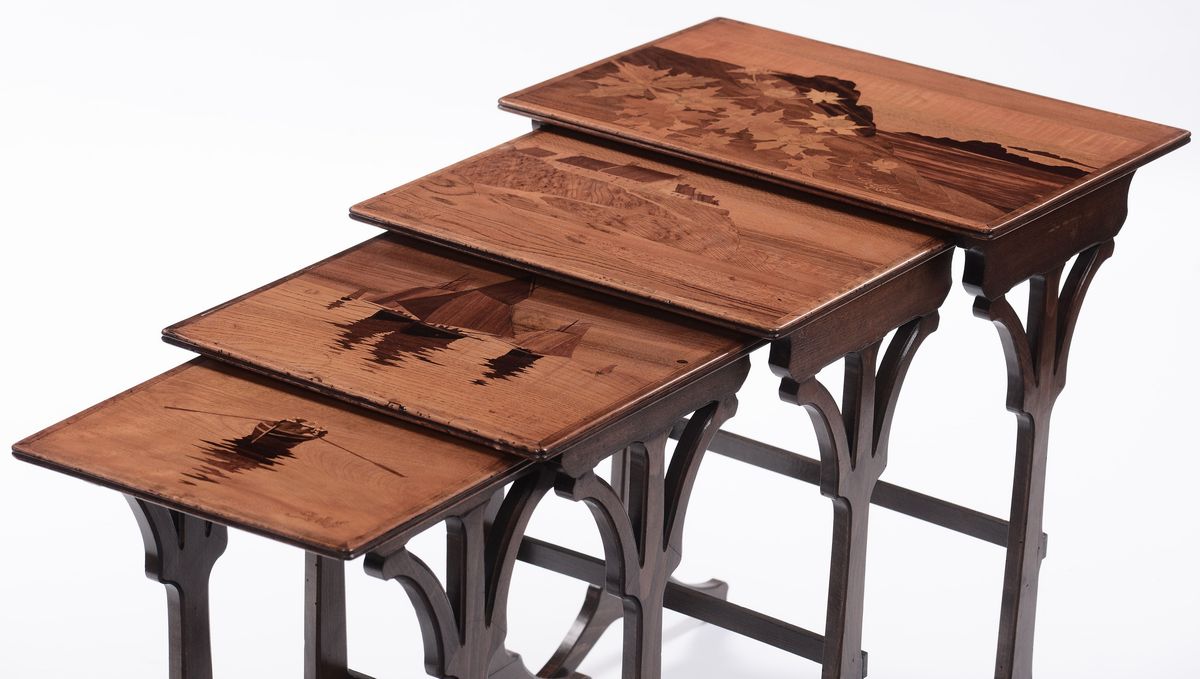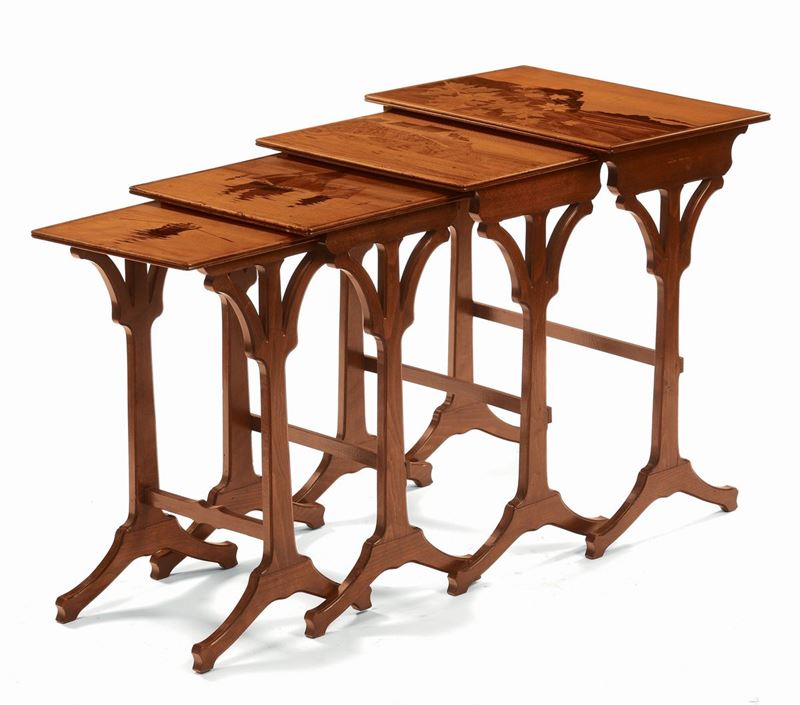 quatto tavolini a nido con piano intarsiato con paesaggi, montanti riuniti da traverse, firmati sul piano, cm 58x38x70. 1900 circa