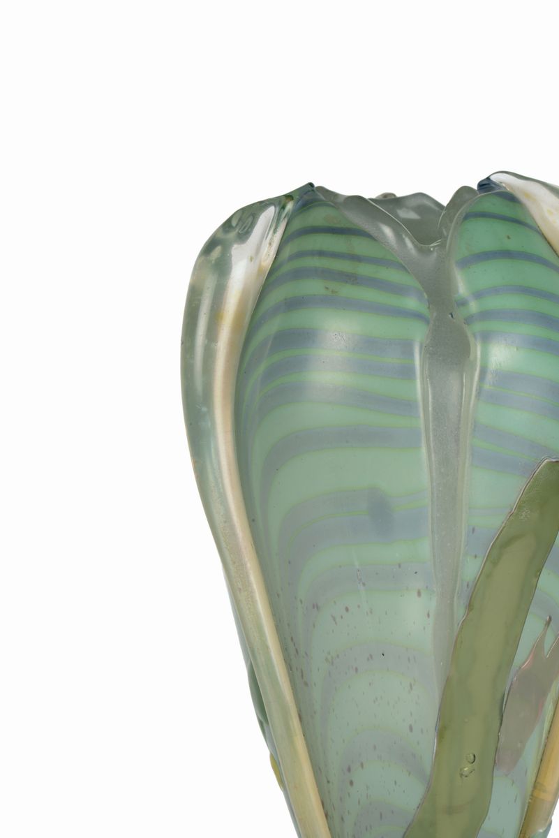 Eccezionale vaso floreale che comprende svariate sfaccettature dell’arte vetraria: dalla marqueterie all’ossidazione per passare all’applicazione. Le superbe colate di vetro incolore applicate in altorilievo animano la superficie del calice. Altezza cm 39. 1890 circa