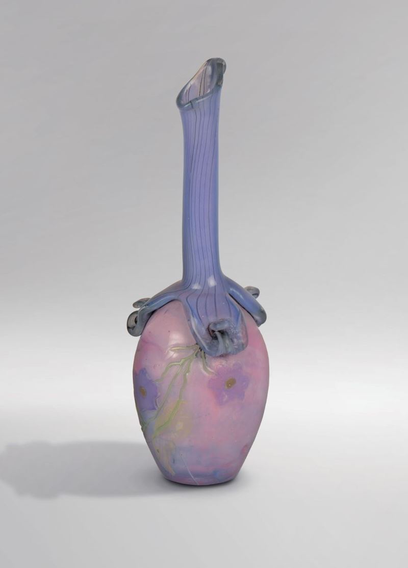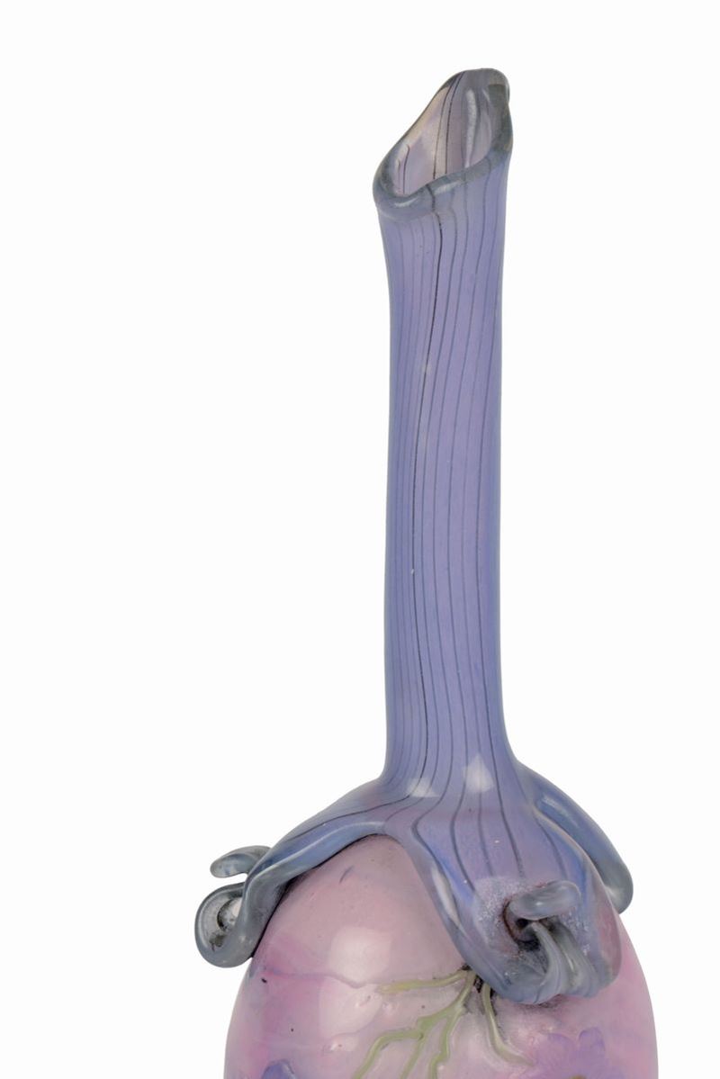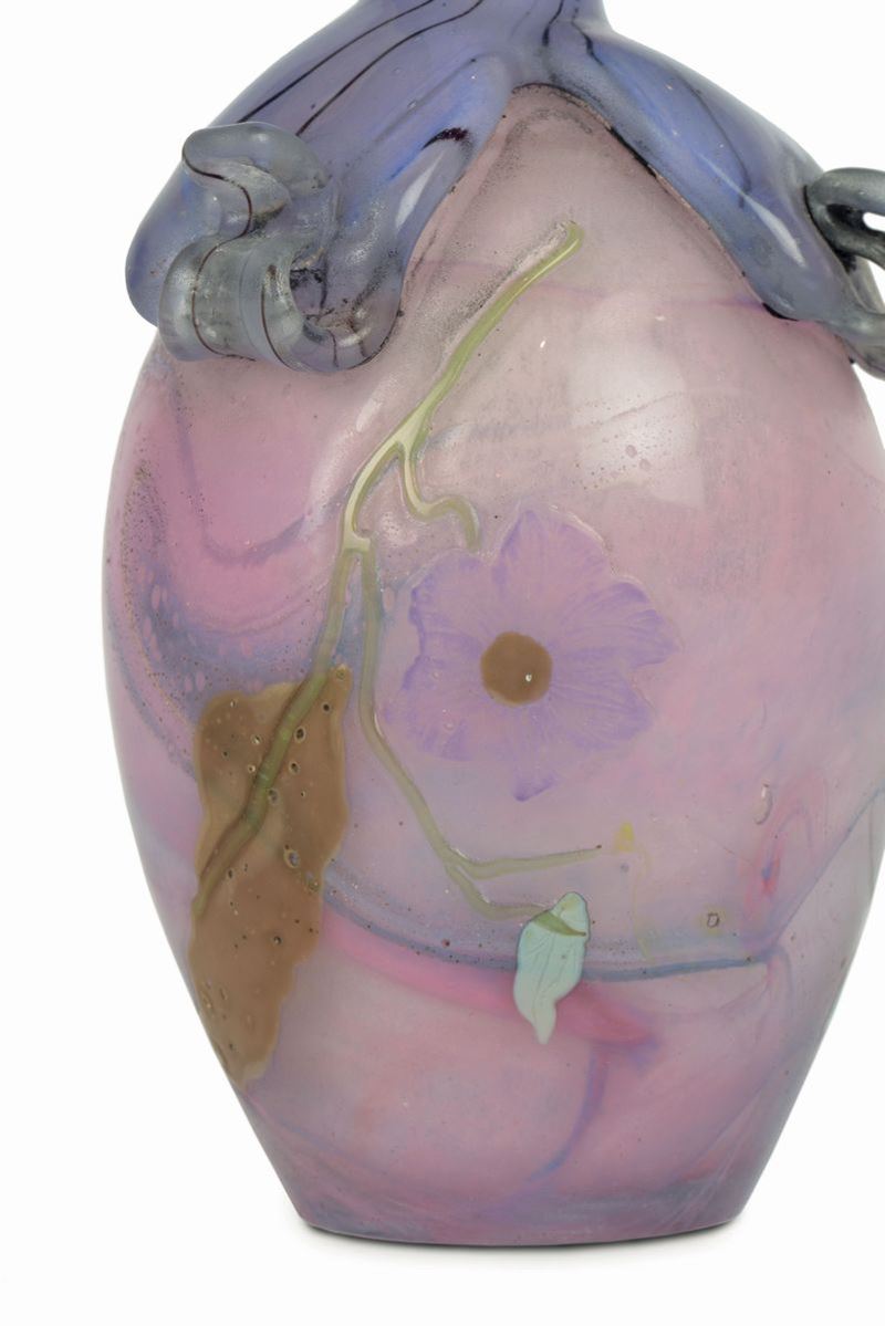 Eccezionale vaso in vetro rosa e viola con inclusione di ossidi metallici. L'importanza dell'oggetto è sottolineata dalla perizia nell'impiego della marqueterie nella creazione del decoro floreale. Firma alla giapponese sul corpo. 1900 circa. Altezza cm 28