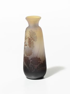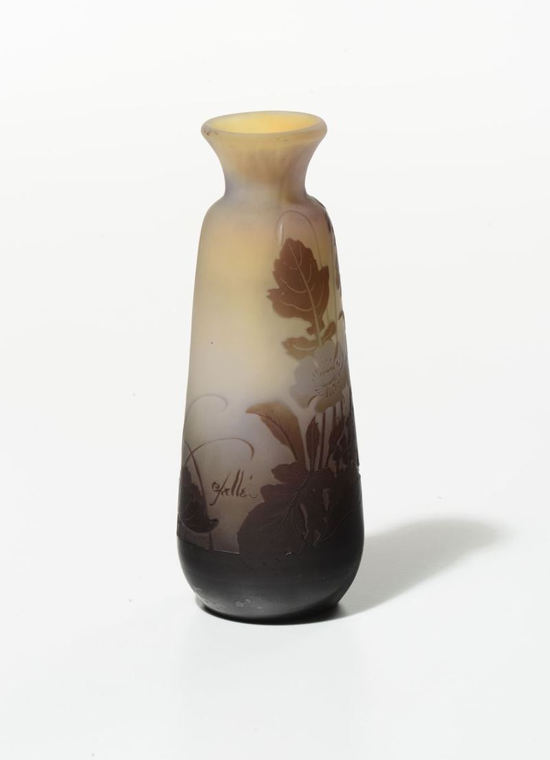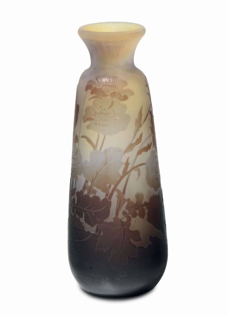 Piccolo vaso in vetro multistrato policromo lavorato a cammeo con decoro floreale. Firma in rilievo. Altezza cm 15. 1900 circa