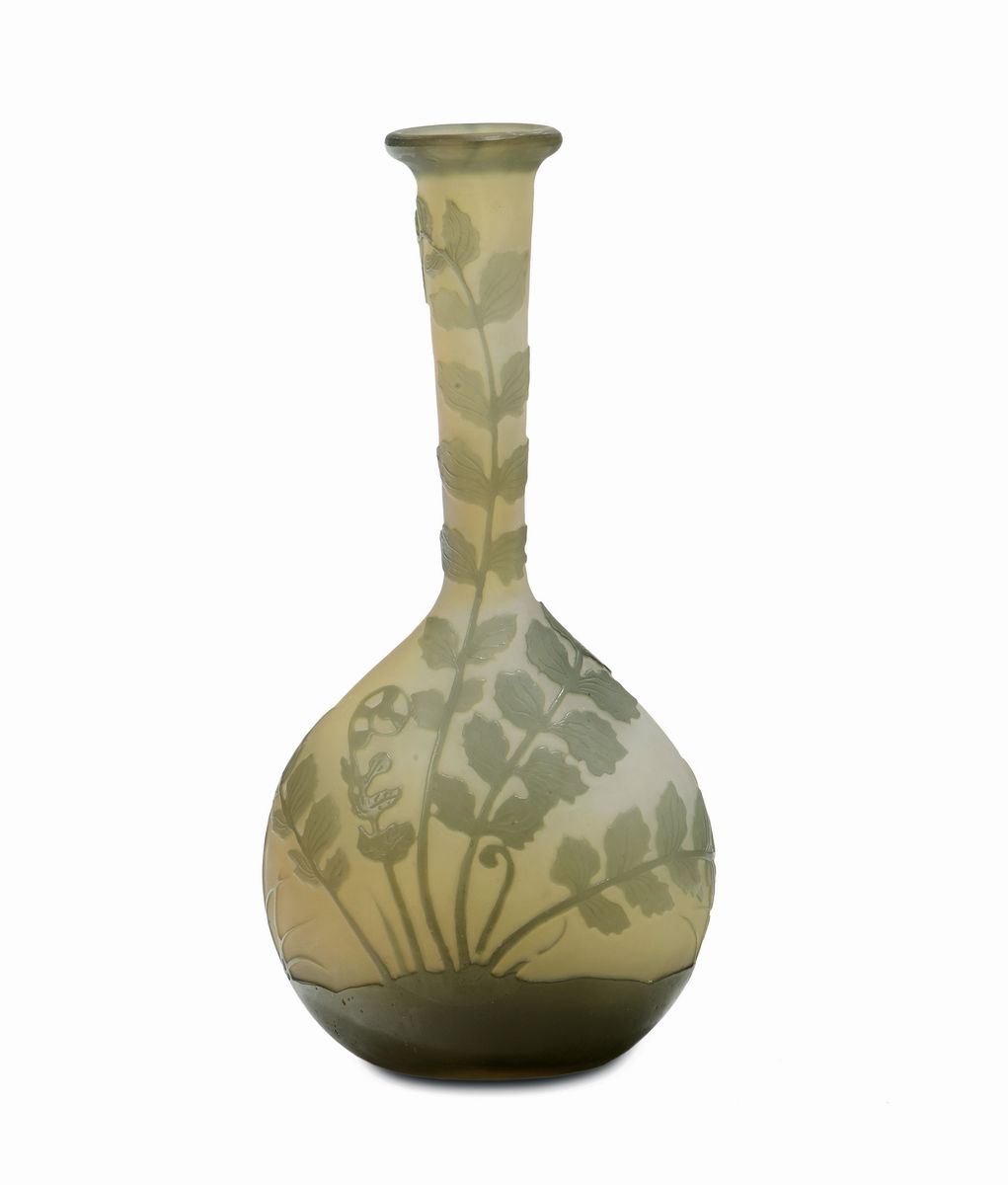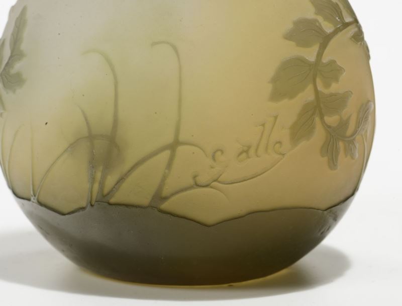 Piccolo vaso in vetro multistrato lavorato a cammeo con decoro vegetale. Firma in rilievo. Altezza cm 17