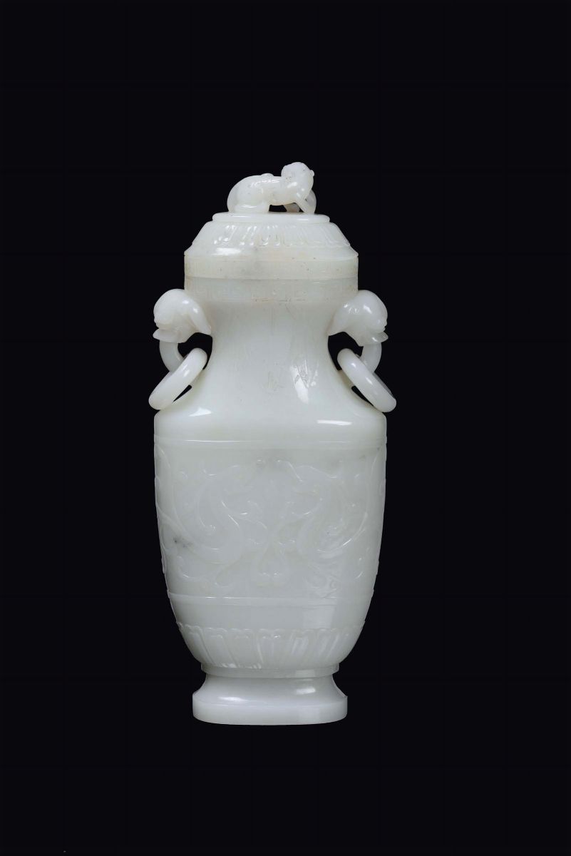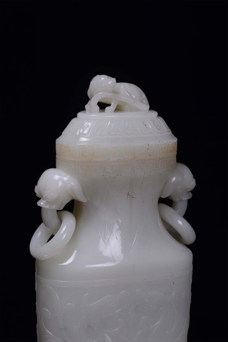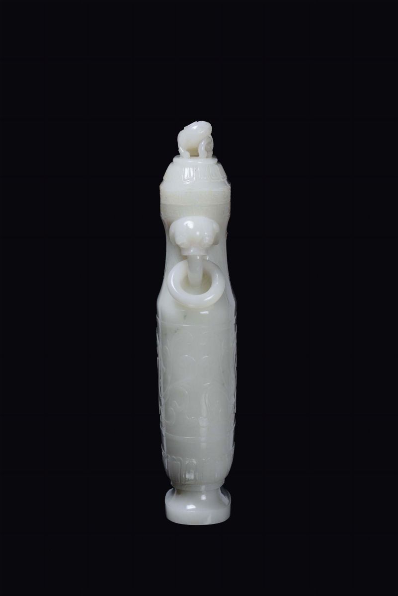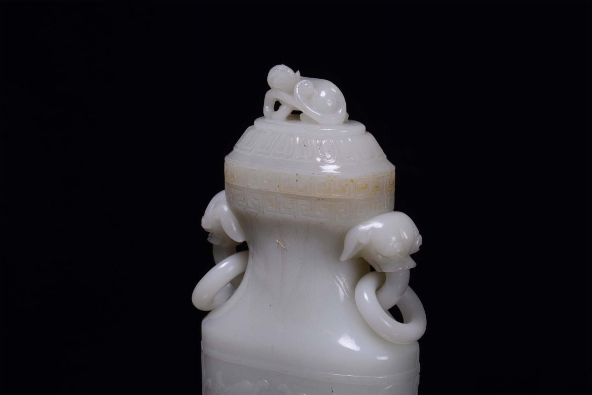 A beautiful white jade vase carved with dragons and Pho dog cover, China, Qing Dynasty, 19th century