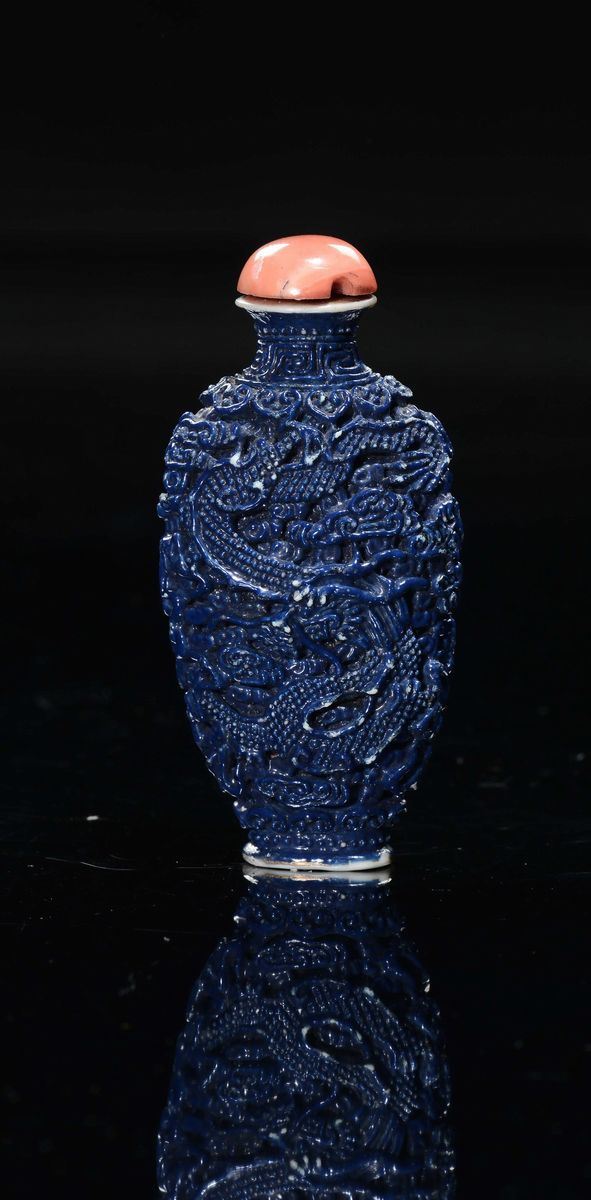 A blue porcelain snuff bottle with phoenix and dragon in relief, China, Qing Dynasty, 19th century