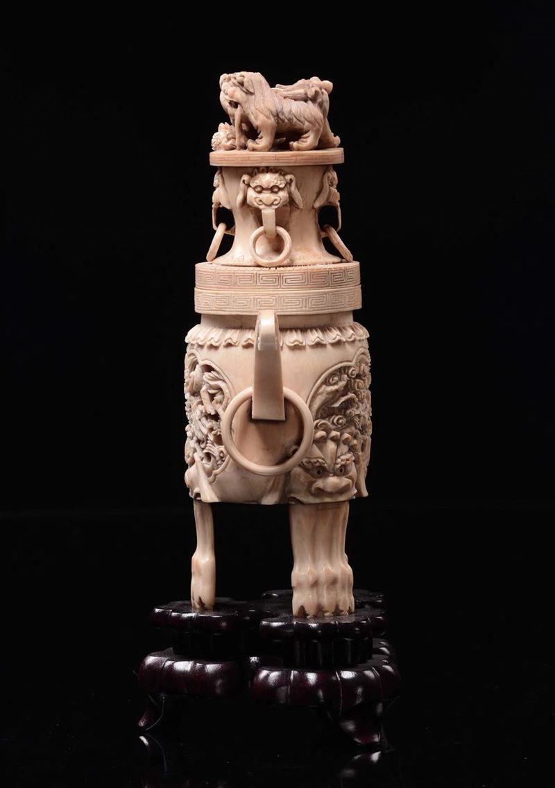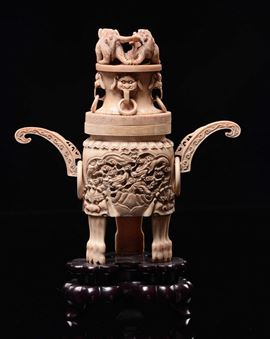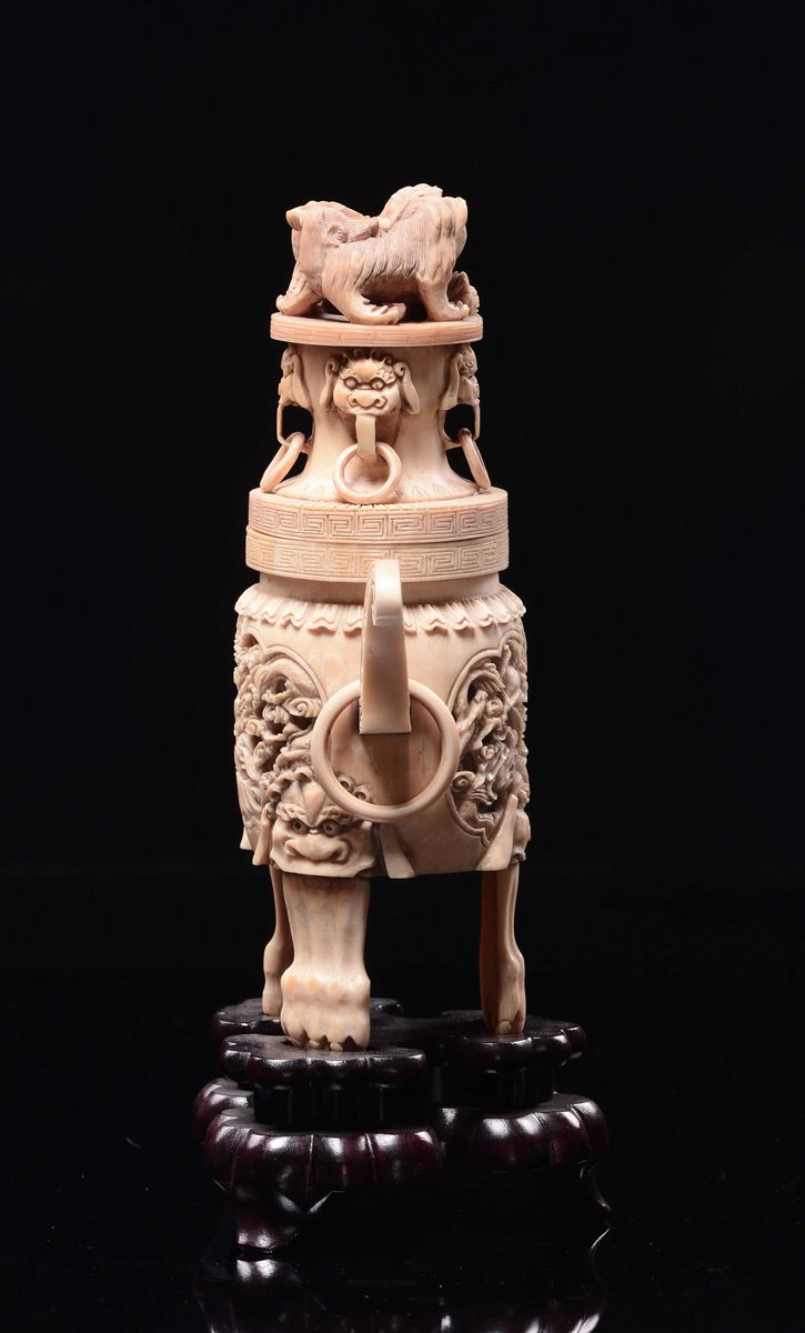 A bone tripod censer with handles, carved with dragons within reserves and cover with Pho dogs, China, Canton, Qing Dynasty, [..]
