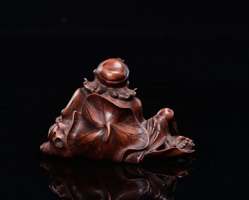 A boxwood old man with bat and sack, China, Qing Dynasty, 19th century