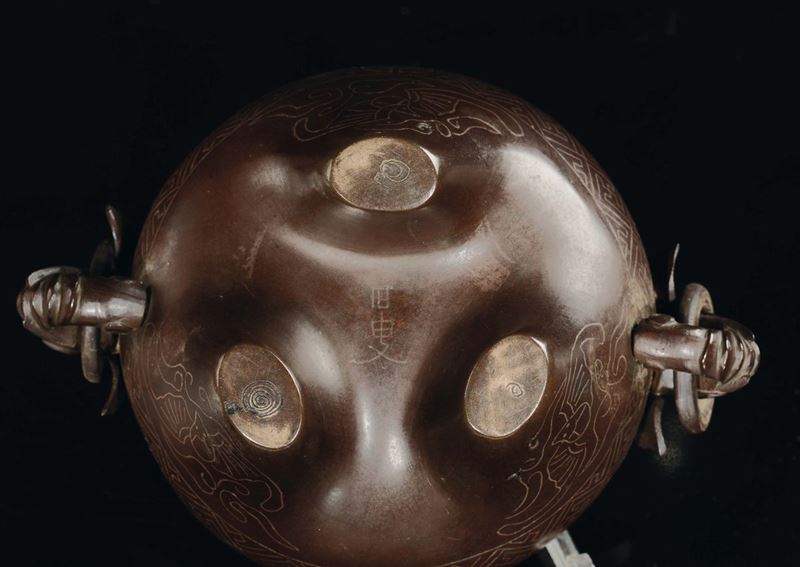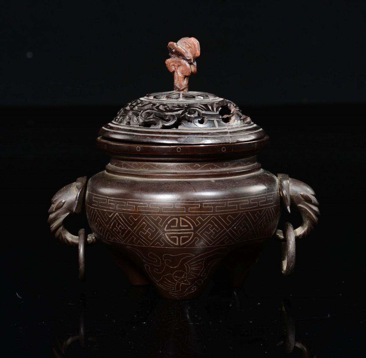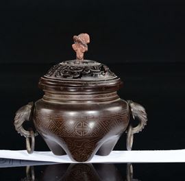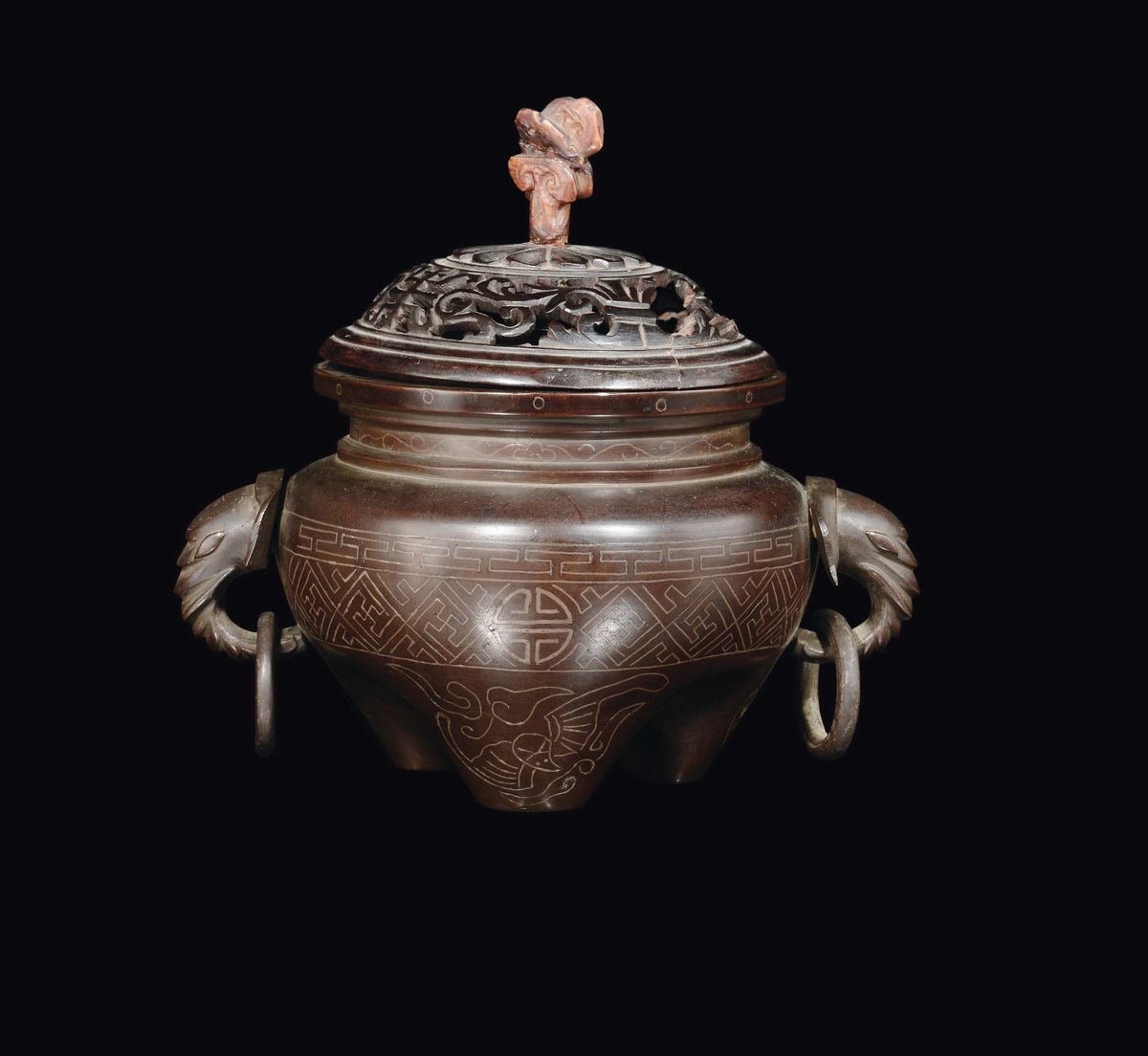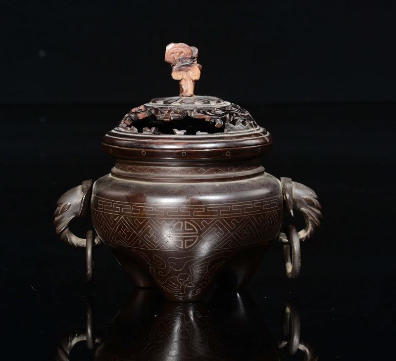 A bronze and silver inserts censer and fretworked wooden cover, China, Qing Dynasty, Qianlong Period (1736-1795)