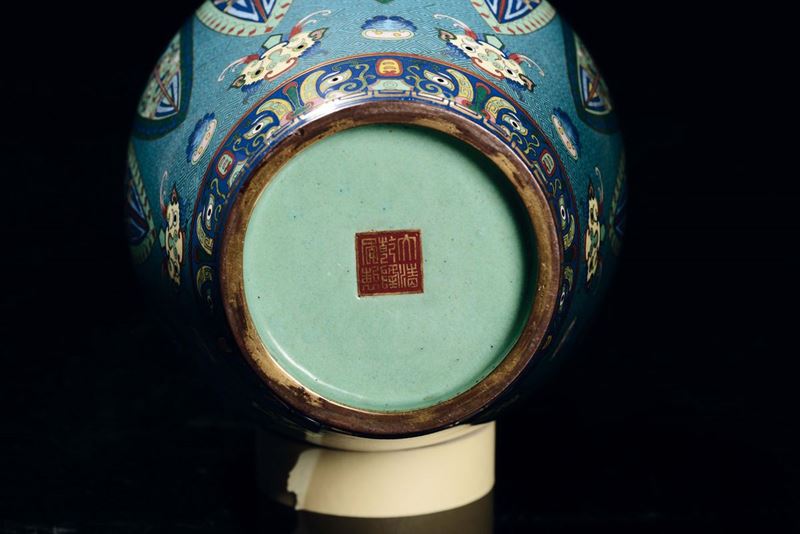 A cloisonné vase with animal faces and geometric archaic style decoration with golden relief fantastic animals, China, Qing [..]