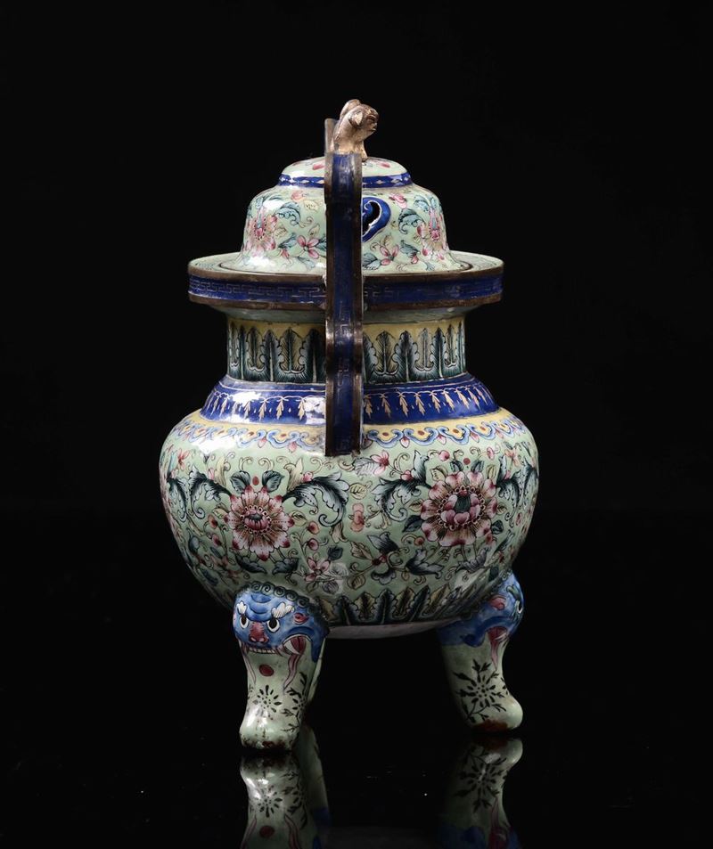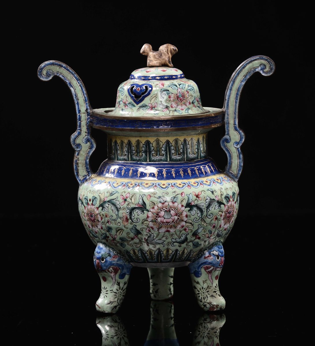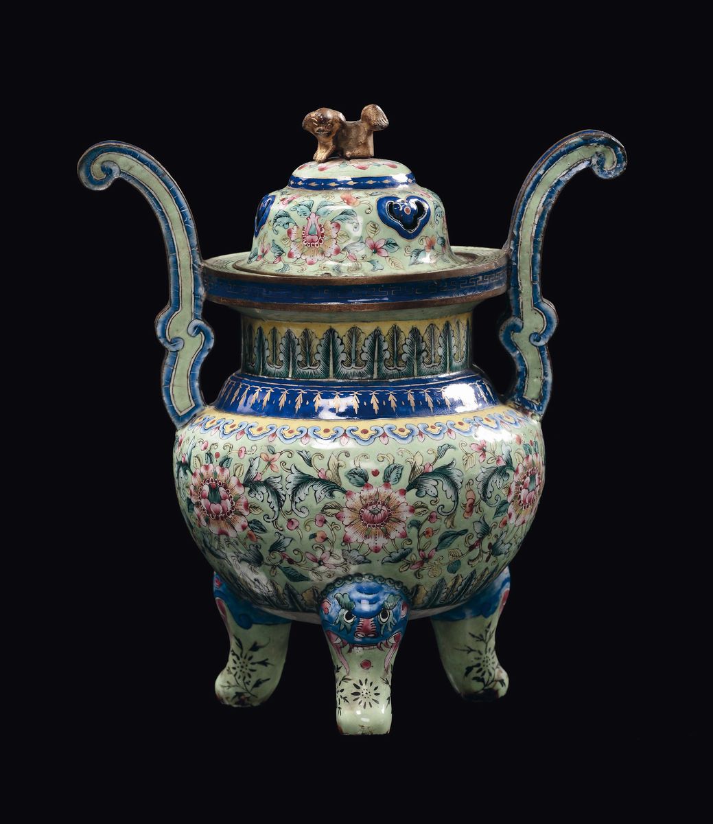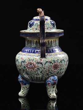 A closionné tripod handeled censer and cover with floral decoration, China, Qing Dynasty, Jiaqing Period, early 19th cent [..]