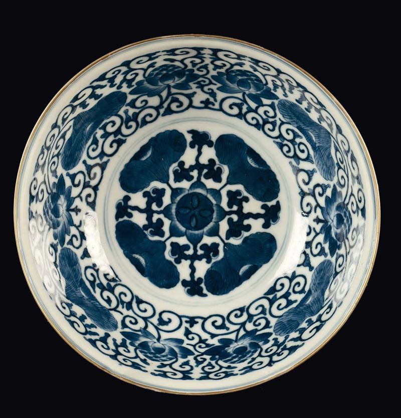decoro con fiori di loto all'esterno policromo e all'interno bianco e blu.diam 17,5