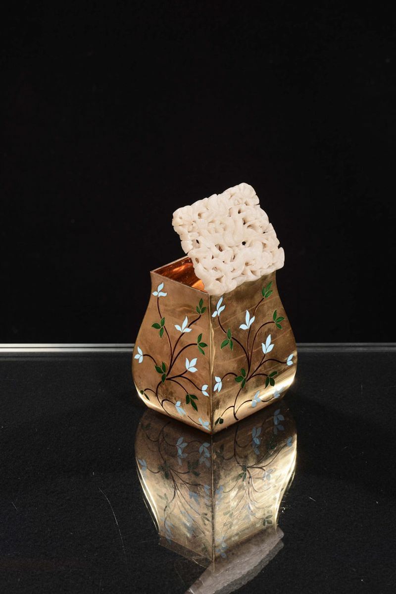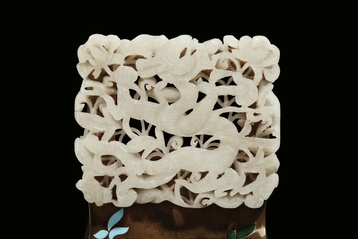 A gilt and enameled metal box with white jade, China, Qing Dynasty, 19th century