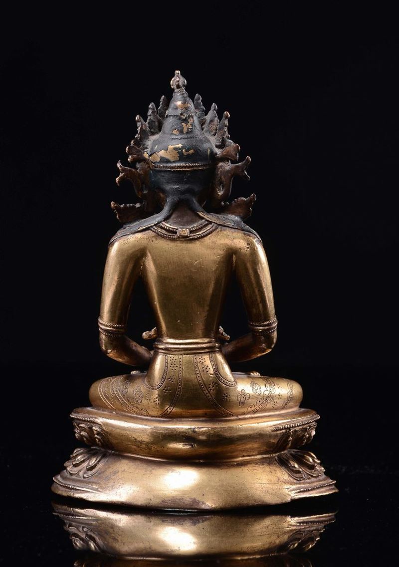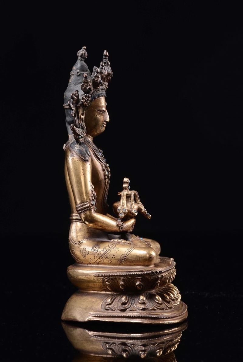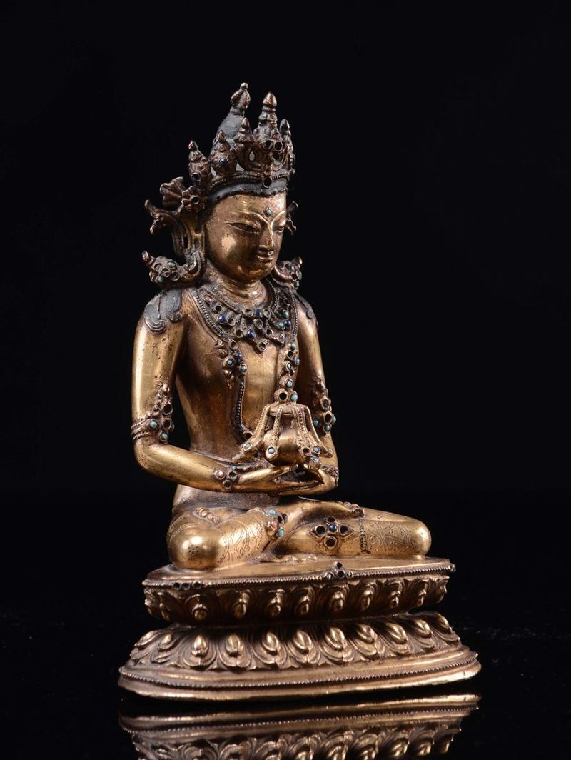 A gilt bronze Amitayus figure seated on a double lotus flower base, China, Qing Dynasty, 18th century