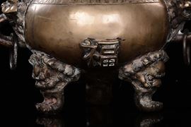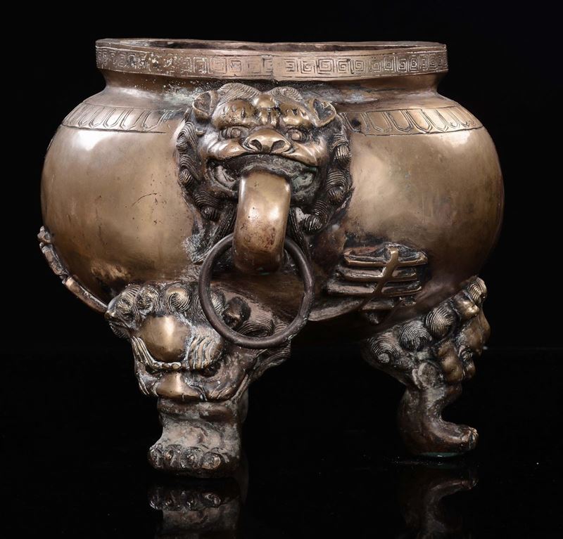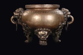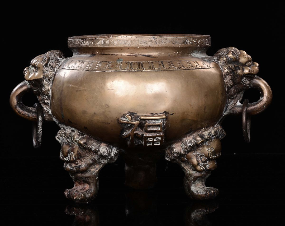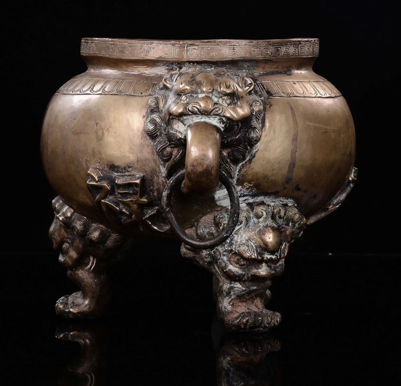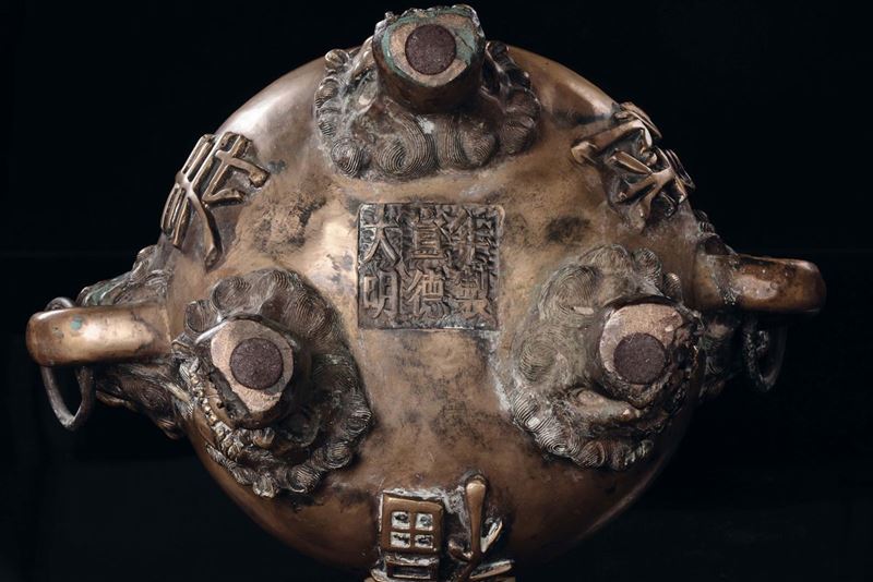 manici ad anelli e piedi d'appoggio ferini. Ideogrammi a rilievo sui latimarchio apocrifo Xuandecm 26,5x46