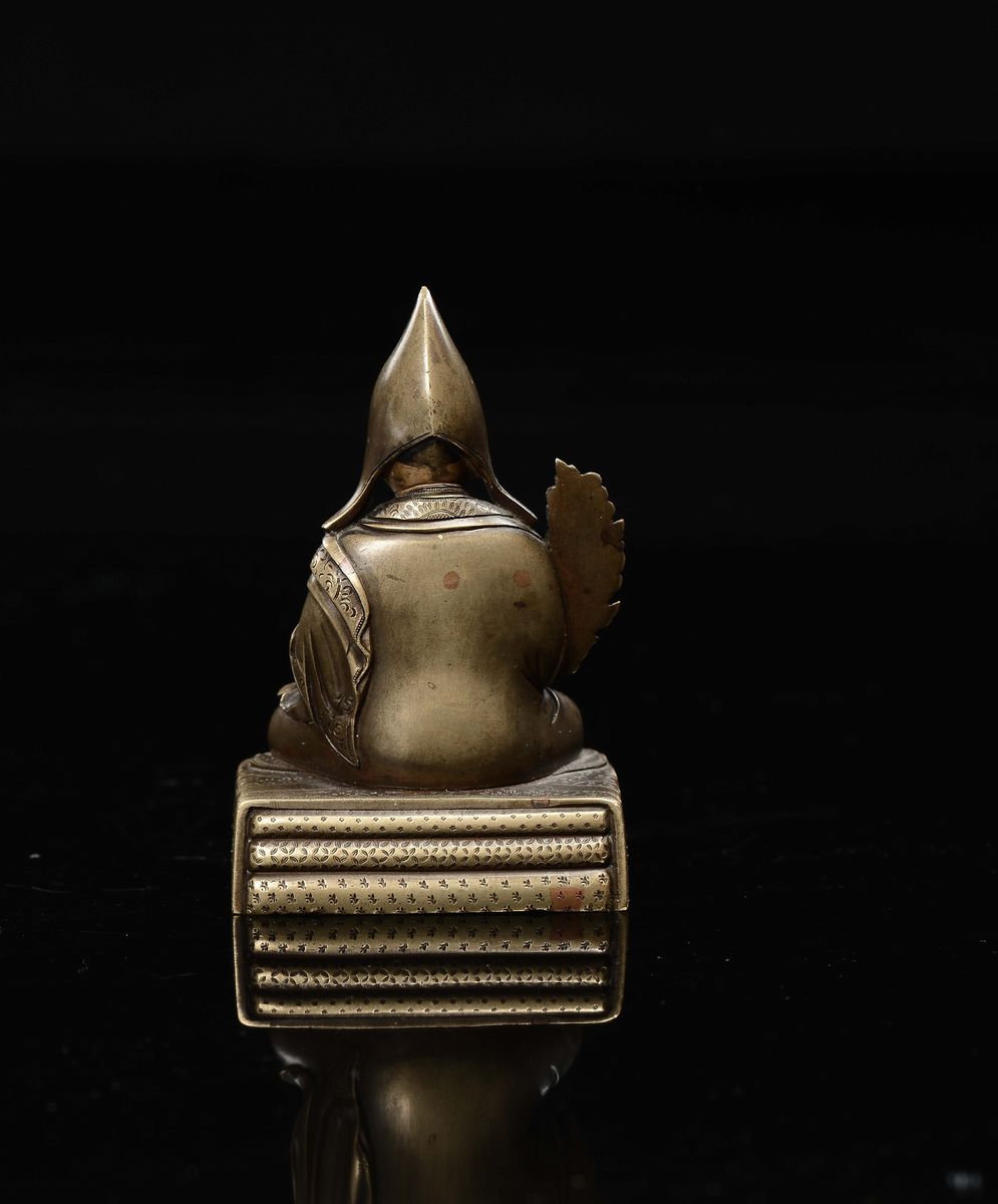 seduto in dhyanasana, mano destra al petto in posizione di vitarkamudra e la mano sinistra abbassta in dhyanamudra. Tra le dita della mano destra stringe un anello e appoggiato al braccio ha un fiore di loto.h cm 10,5