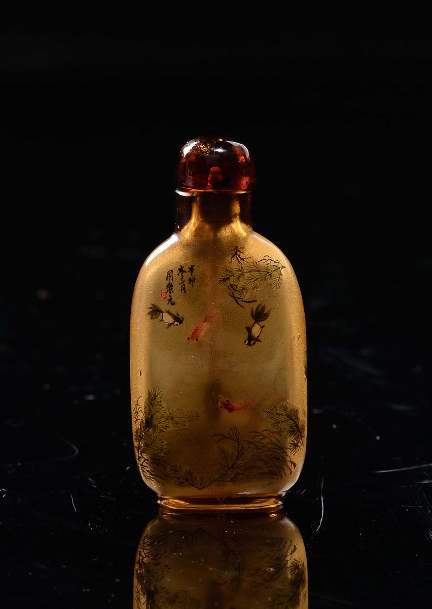 A glass snuff bottle depicting farmer in a landscape with fish and inscriptions, China, Qing Dynasty, 19th century