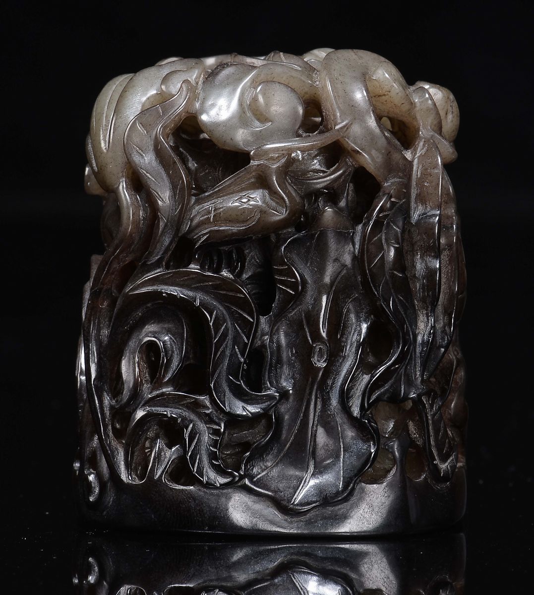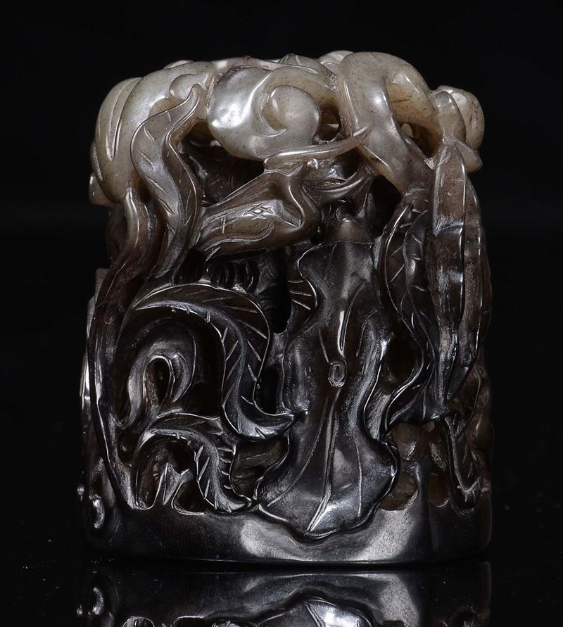 A green jade group with flower and leaves in relief, China, Qing Dynasty, 19th century