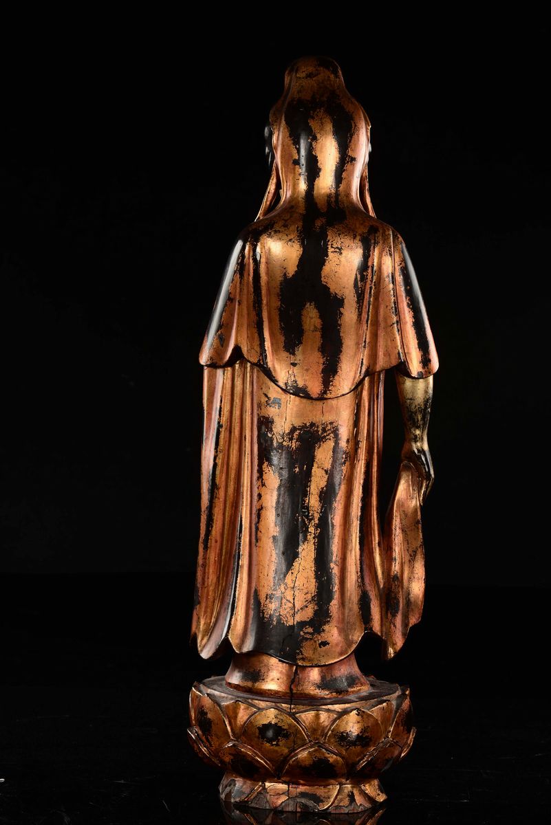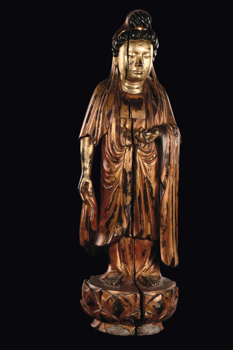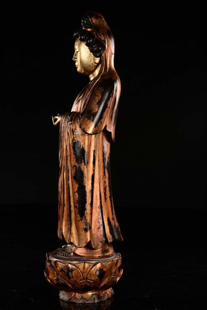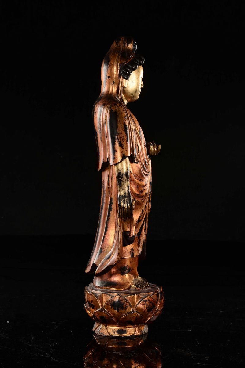 A lacquered wood Guanyin standin on a lotus flower, China, Qing Dynasty, 18th century