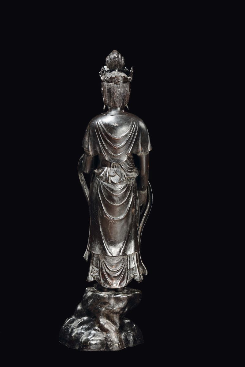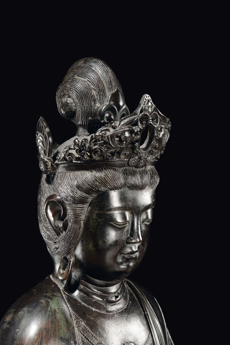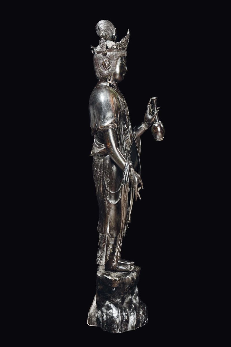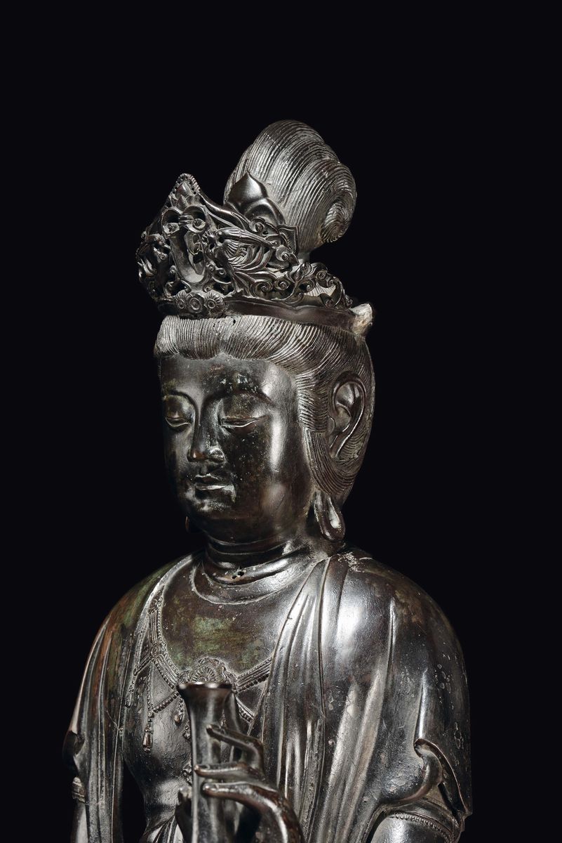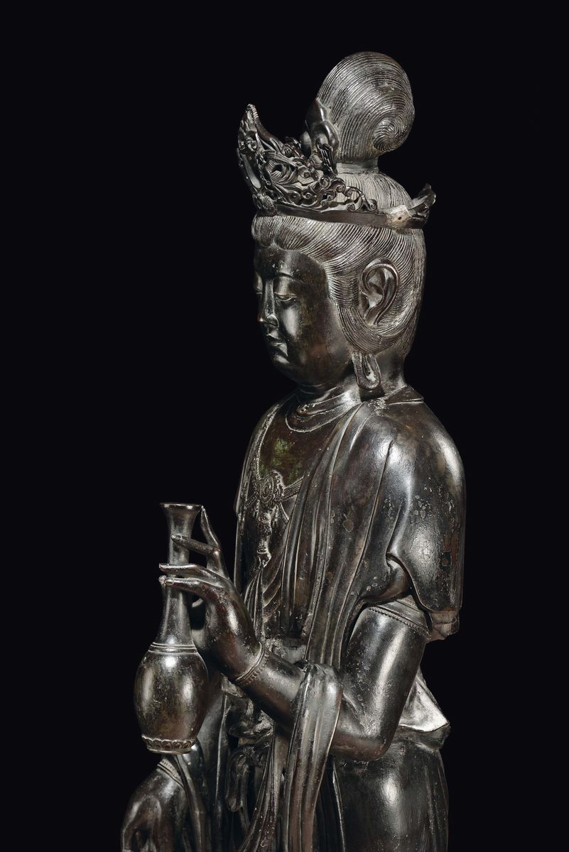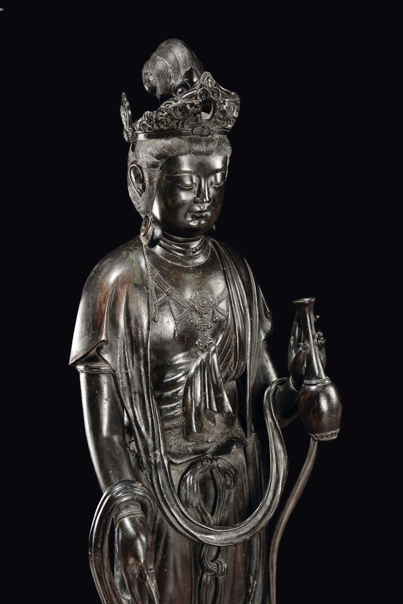 A large bronze crowned Abundantia Goddess with vase in her hand, China, Ming Dynasty, 17th century
