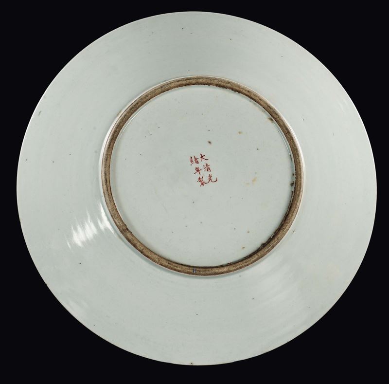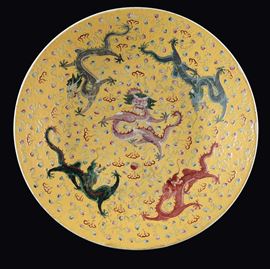 A large yellow-ground porcelain dish with five dragons, China, Qing Dynasty, Guangxu Mark and Period (1875-1908)