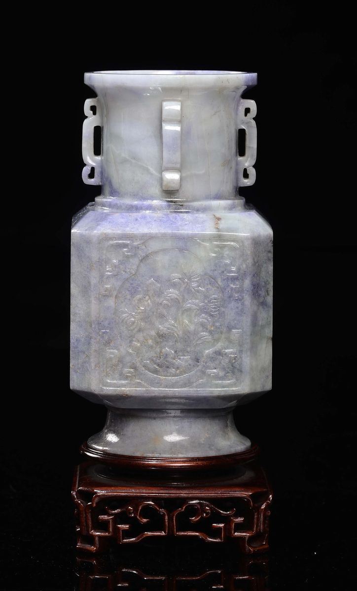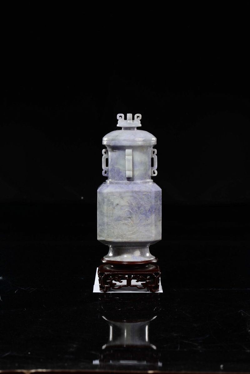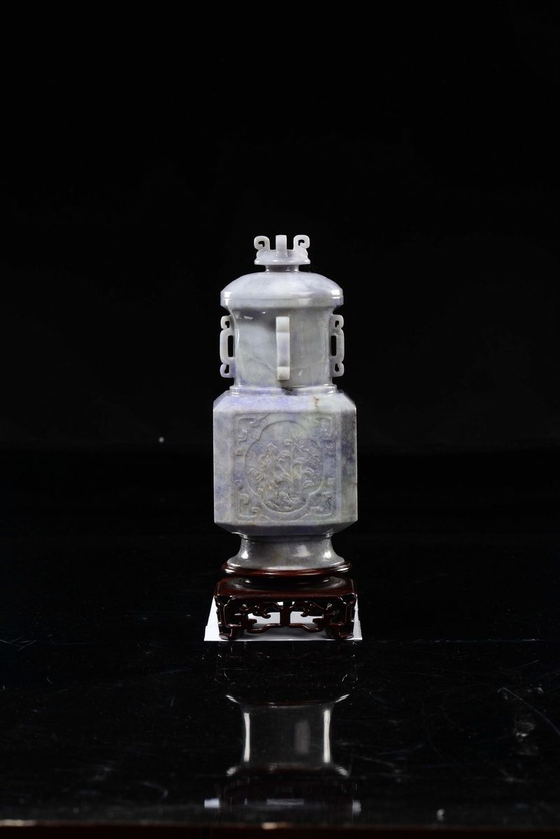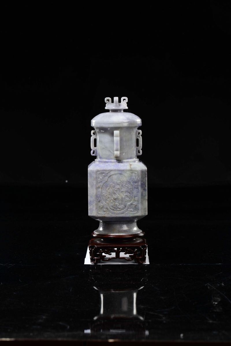 A lavender jadeite vase and cover with flowers within reserves, China, Qing Dynasty, 19th century