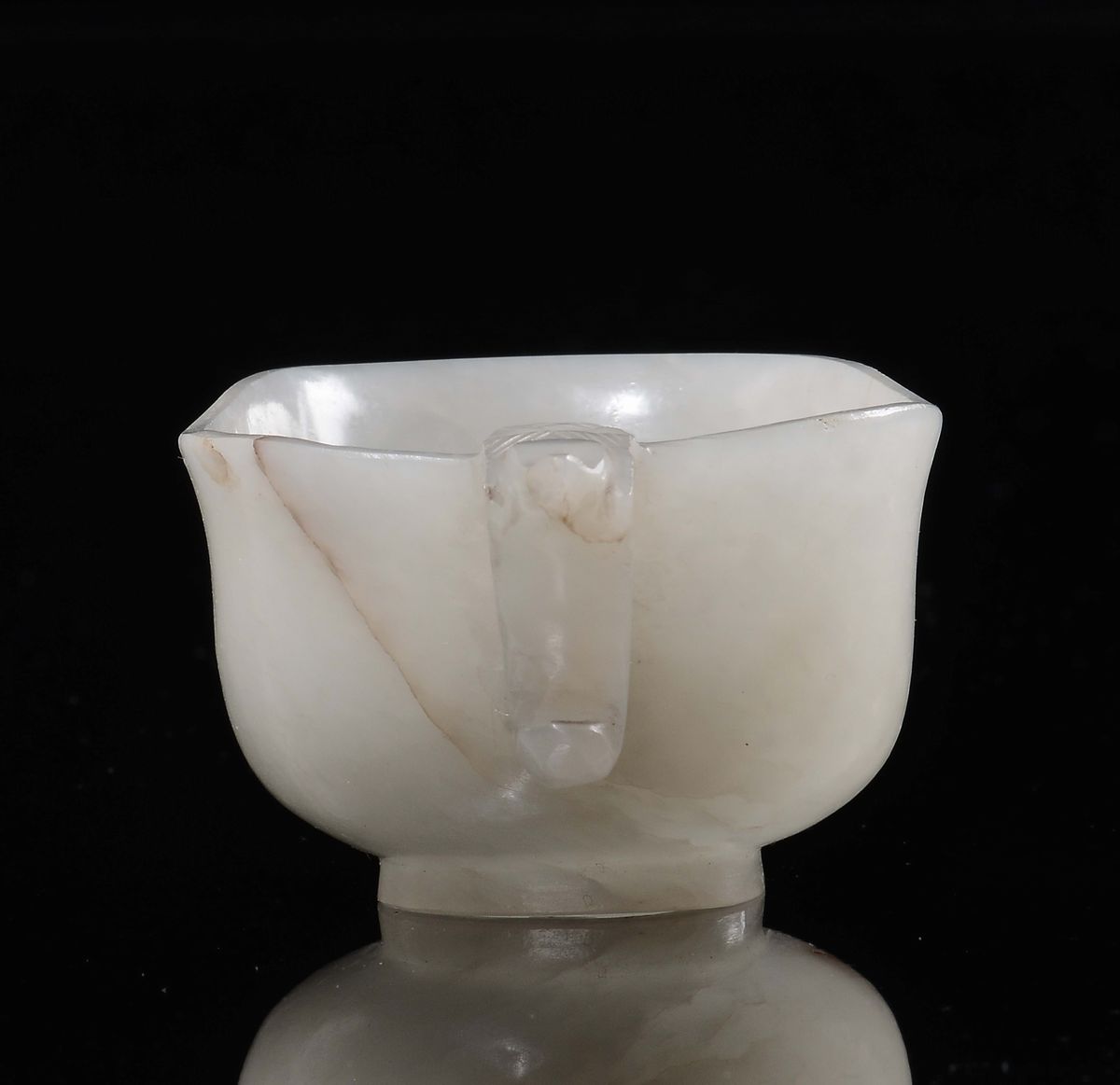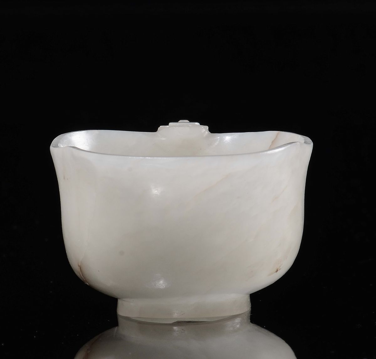 A lot formed by one small Celadon jade bowl with inscriptions and two white jade cups, one with dragon handles, China, Qing Dynasty, 19th century
