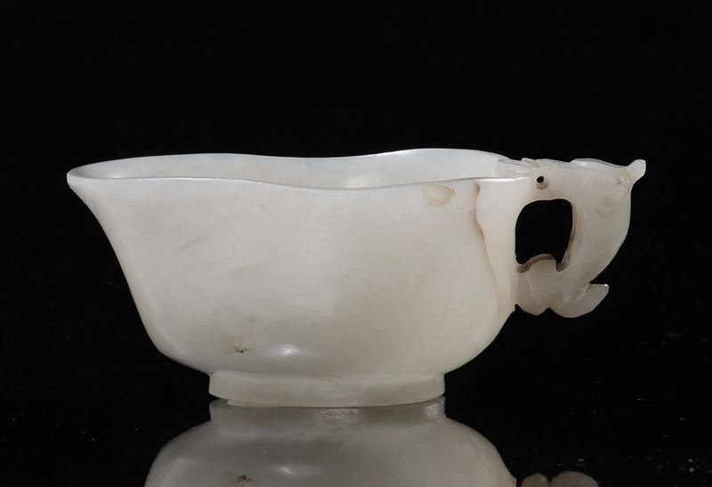 A lot formed by one small Celadon jade bowl with inscriptions and two white jade cups, one with dragon handles, China, Qing [..]