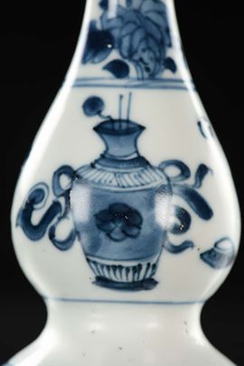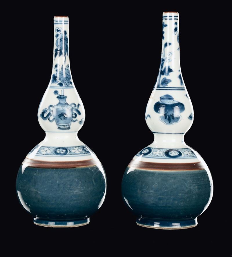 A pair of blue and white double-pumpkin small vases depicting flowers and with gilt outline, China, Qing Dynasty, Kangxi Period (1662-1722)