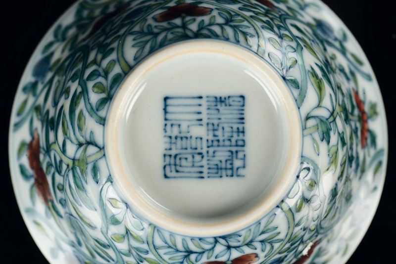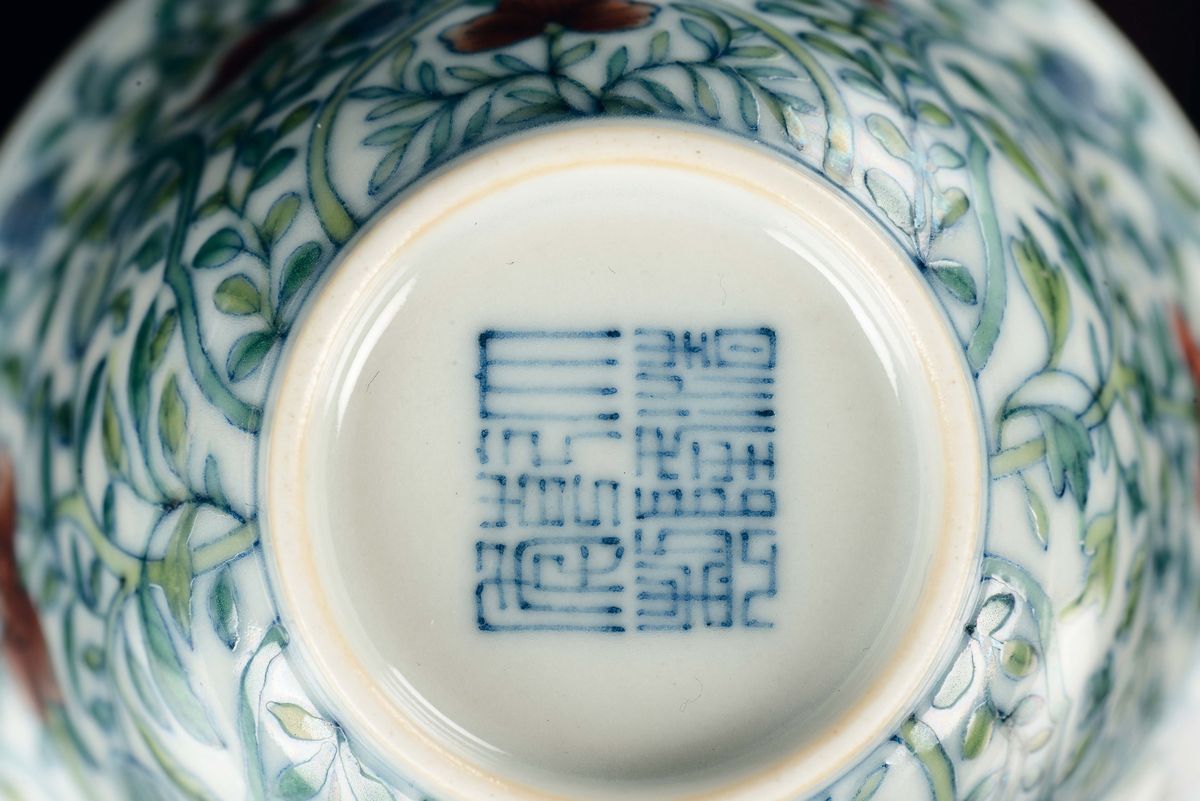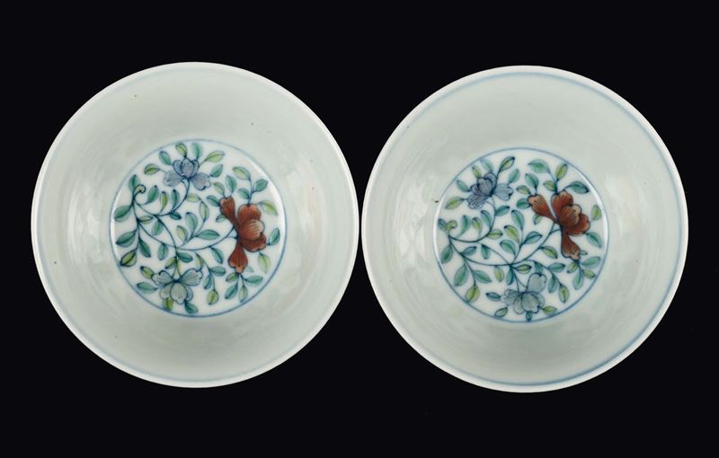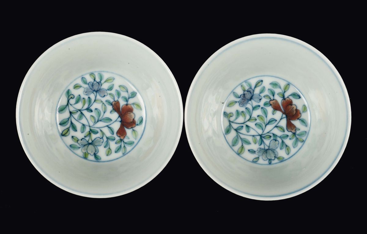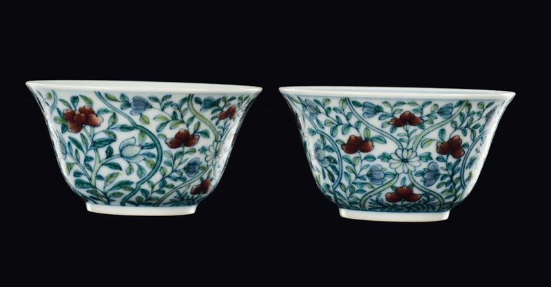 A pair of Ducai porcelain cups with floral decoration, China, 20th century