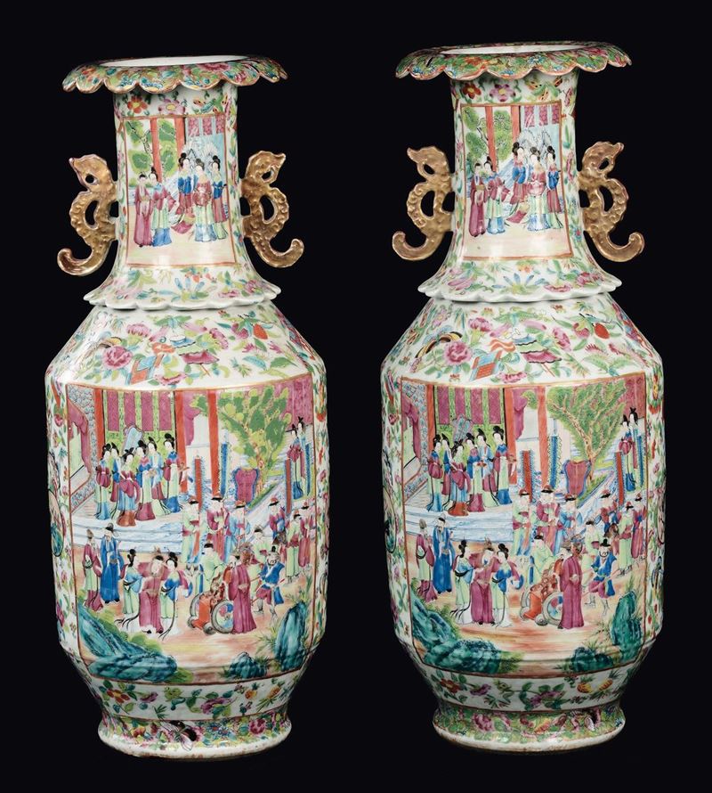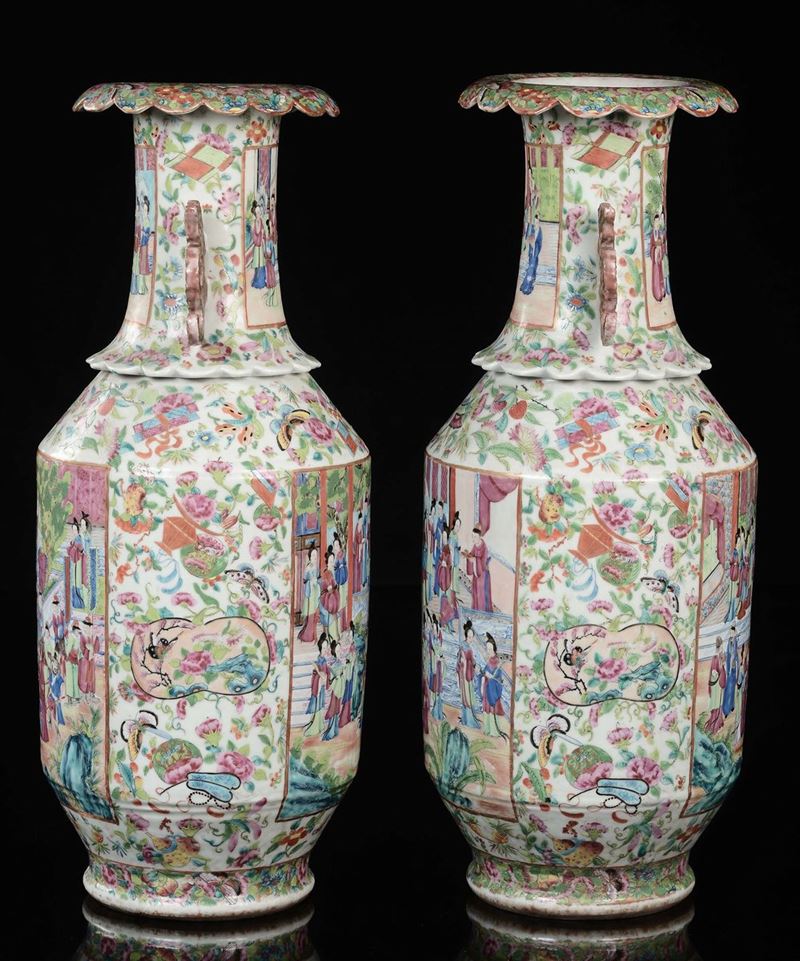 A pair of Famille Rose double handles vases with groups of Guanyin within reserves, China, Qing Dynasty, 19th century