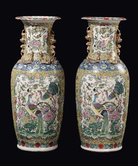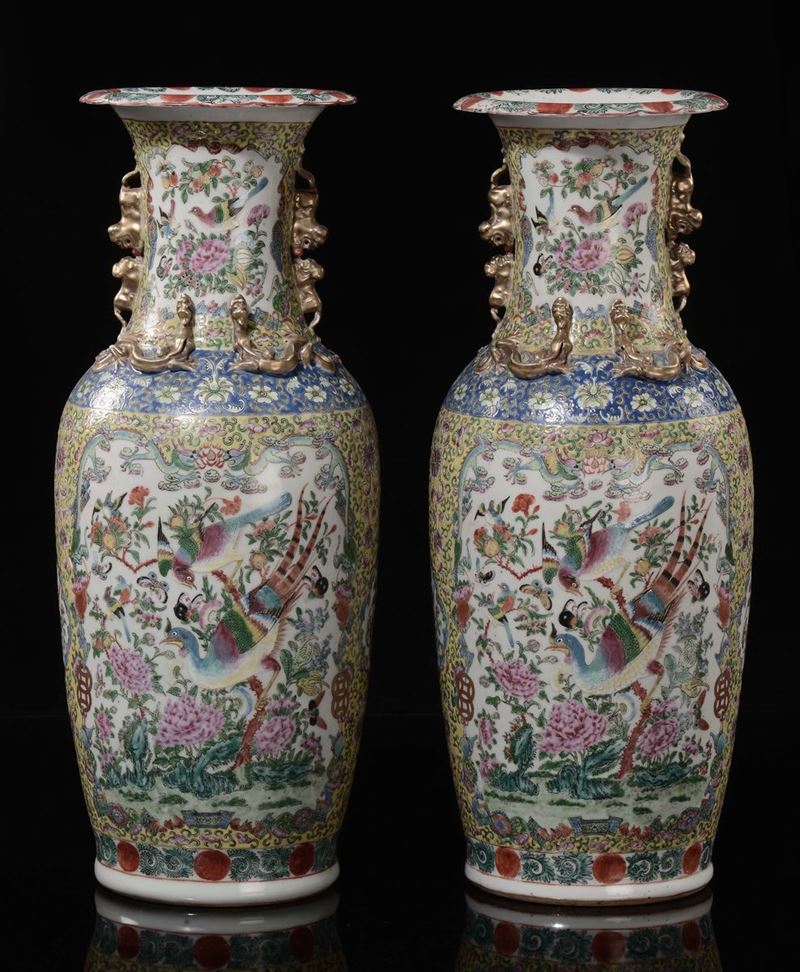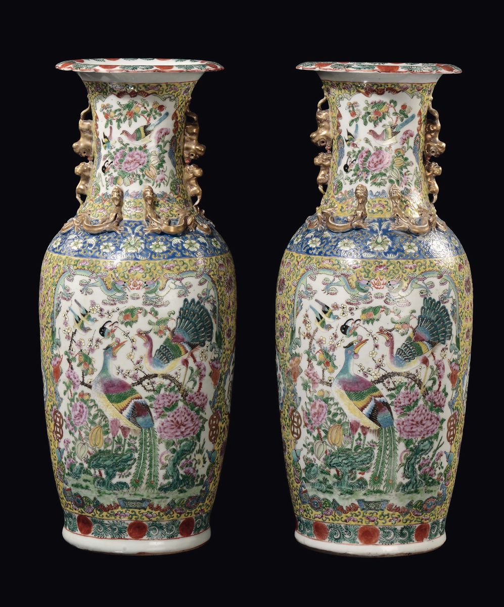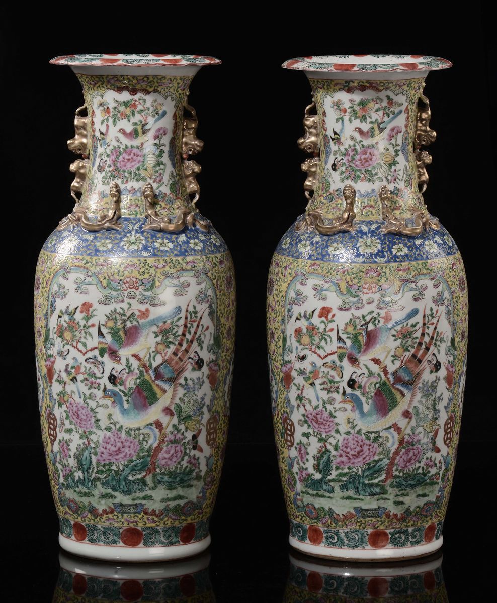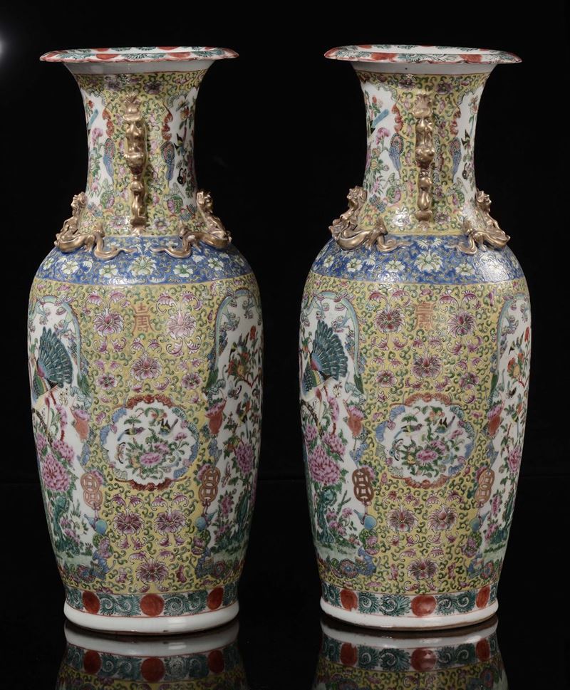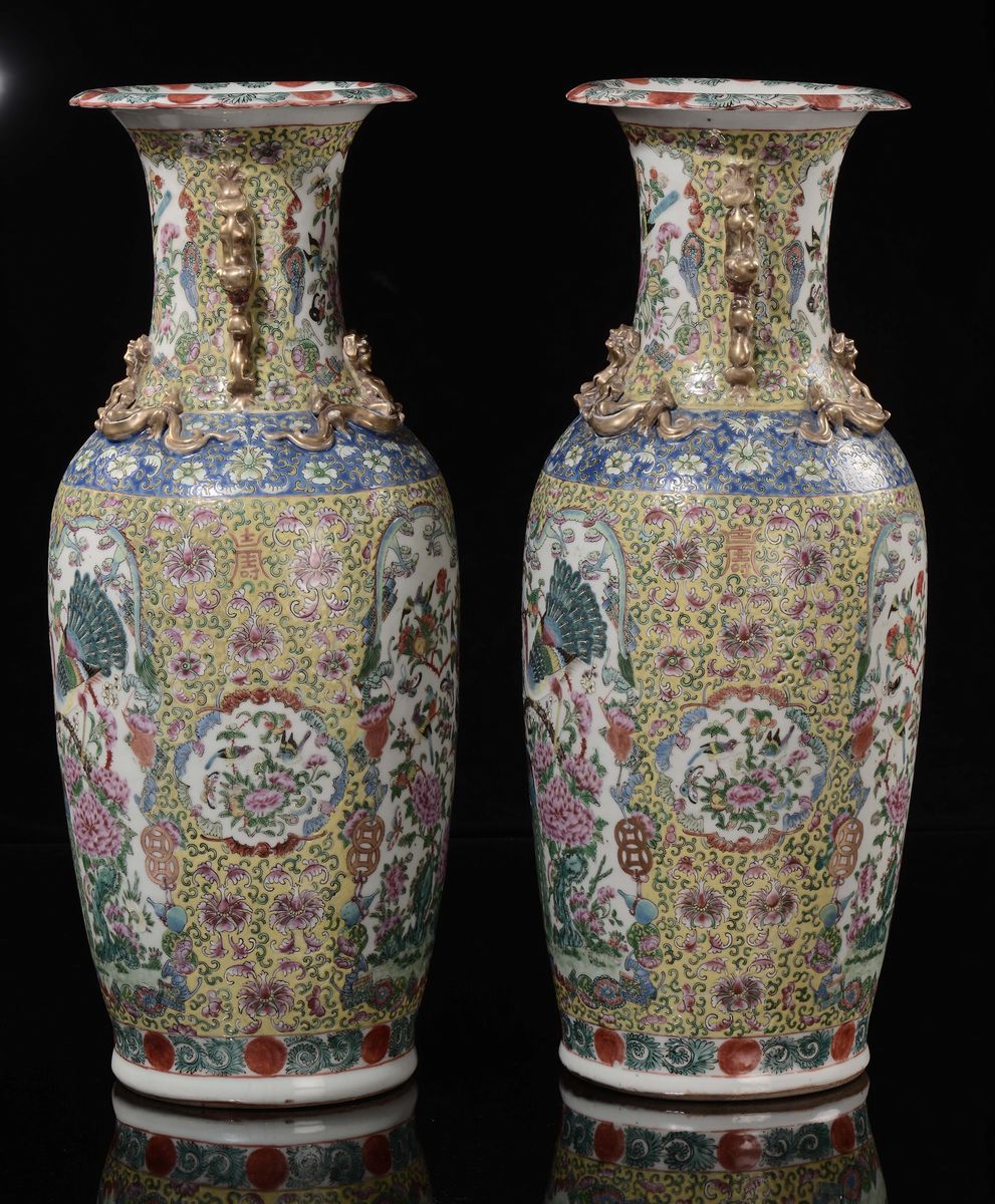 A pair of Famille Rose yellow-ground vase with birds and flowers within reserves and gilt dragons in relief, China, Qing [..]
